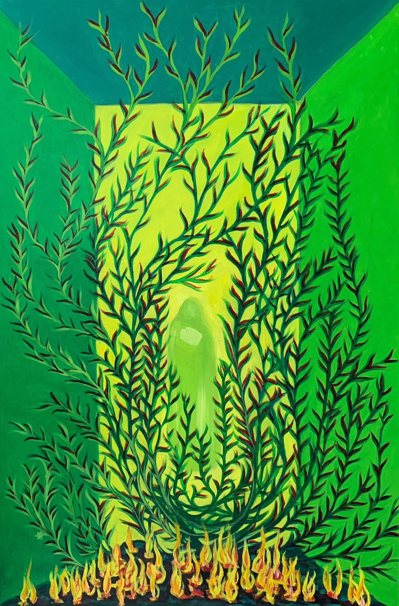 geïnspireerd op de ramen van Ronchamp raam met een figuur op de achtergrond (Mozes) vuur en een struik op de voorgrond, overwegend in groenen geschilderd