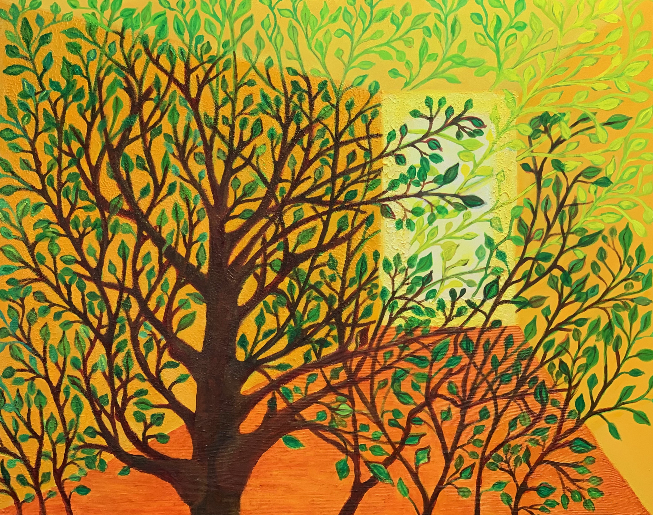 Schilderij geïnspireerd op kapel van Ronchamp kroon van de boom die doorloopt in de boom van 2 Leven hieronder groei en vernieuwing