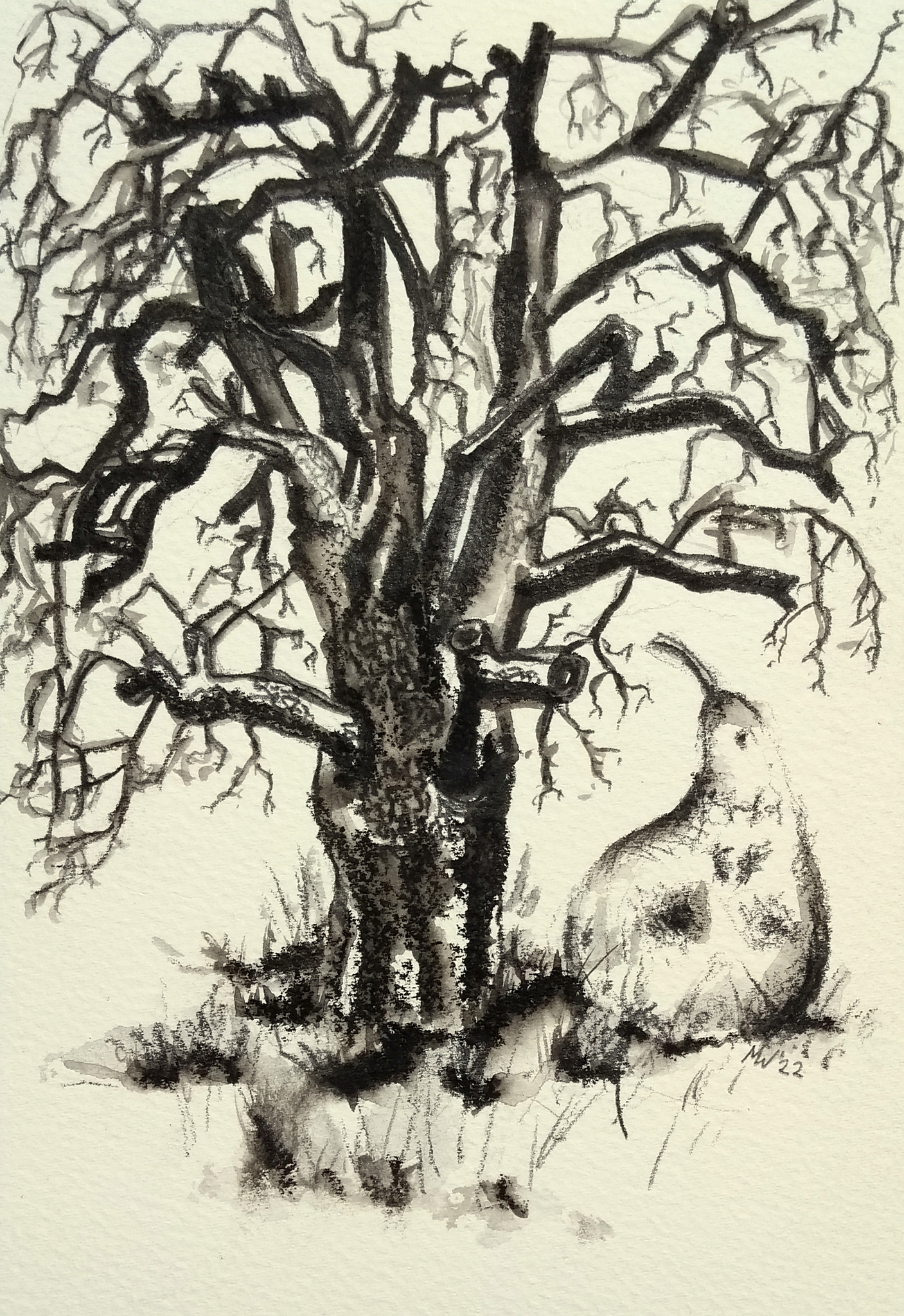 Dode Perenboom aan de Italiëstraat in Nijmegen-Noord. Lyra Groove Triple 1, andere (aquarel-)potloden en water op 300 grams aquarelpapier.