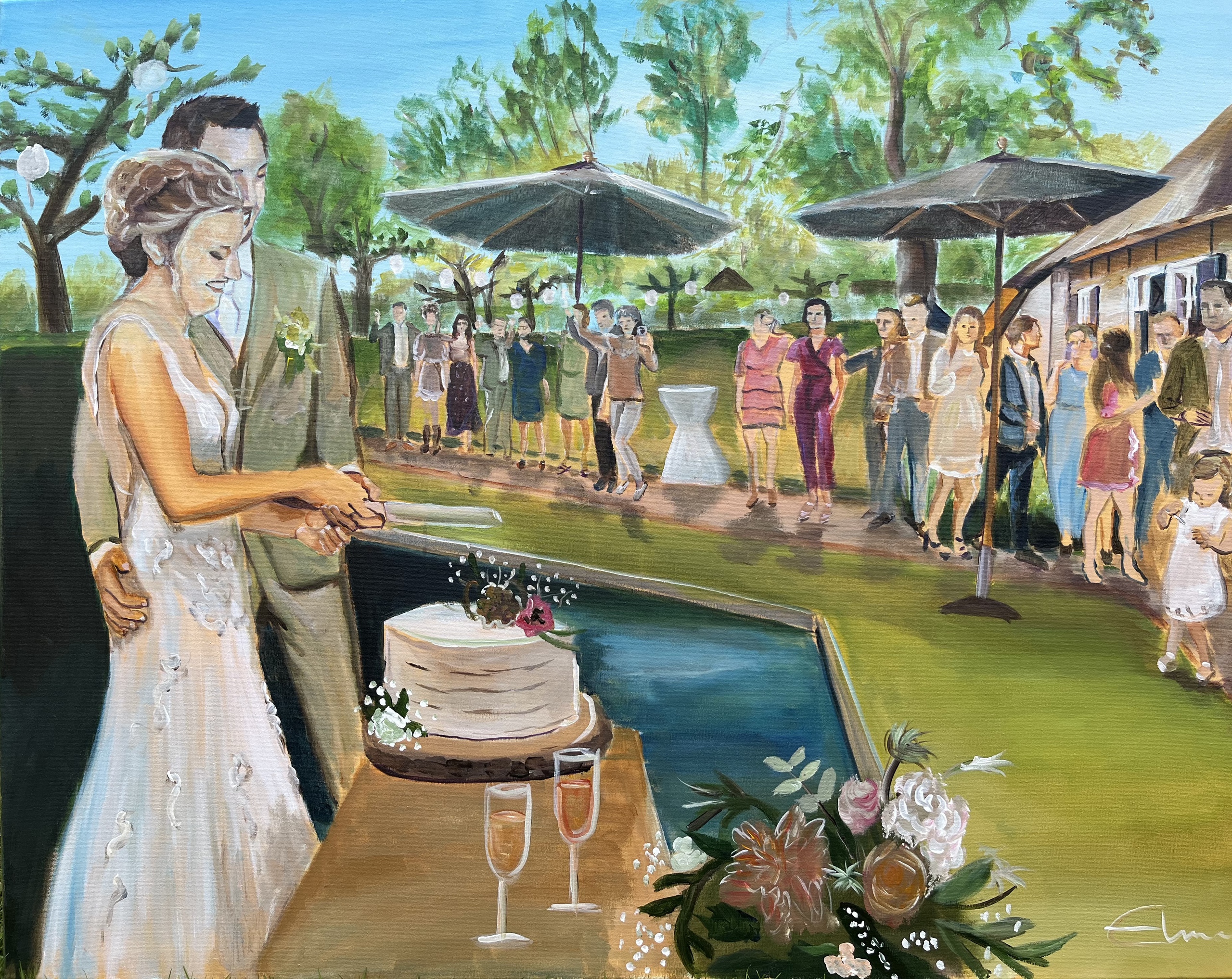 Bruiloft Trouwen Taart Aansnijden Schilderij Bruidspaar Cadeau Livepaint Live Paint