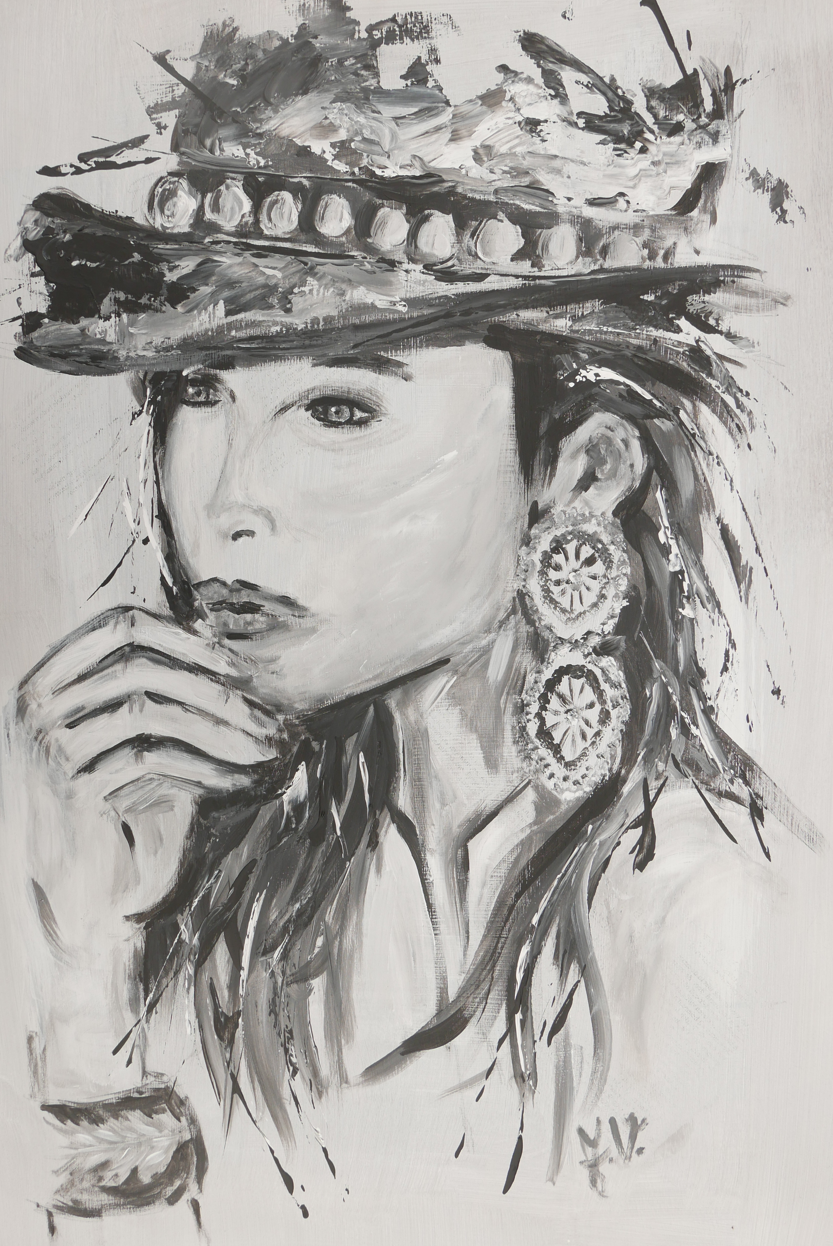 zwartwit met grove kwast en paletmes geschilderde vrouw in bohemian stijl.