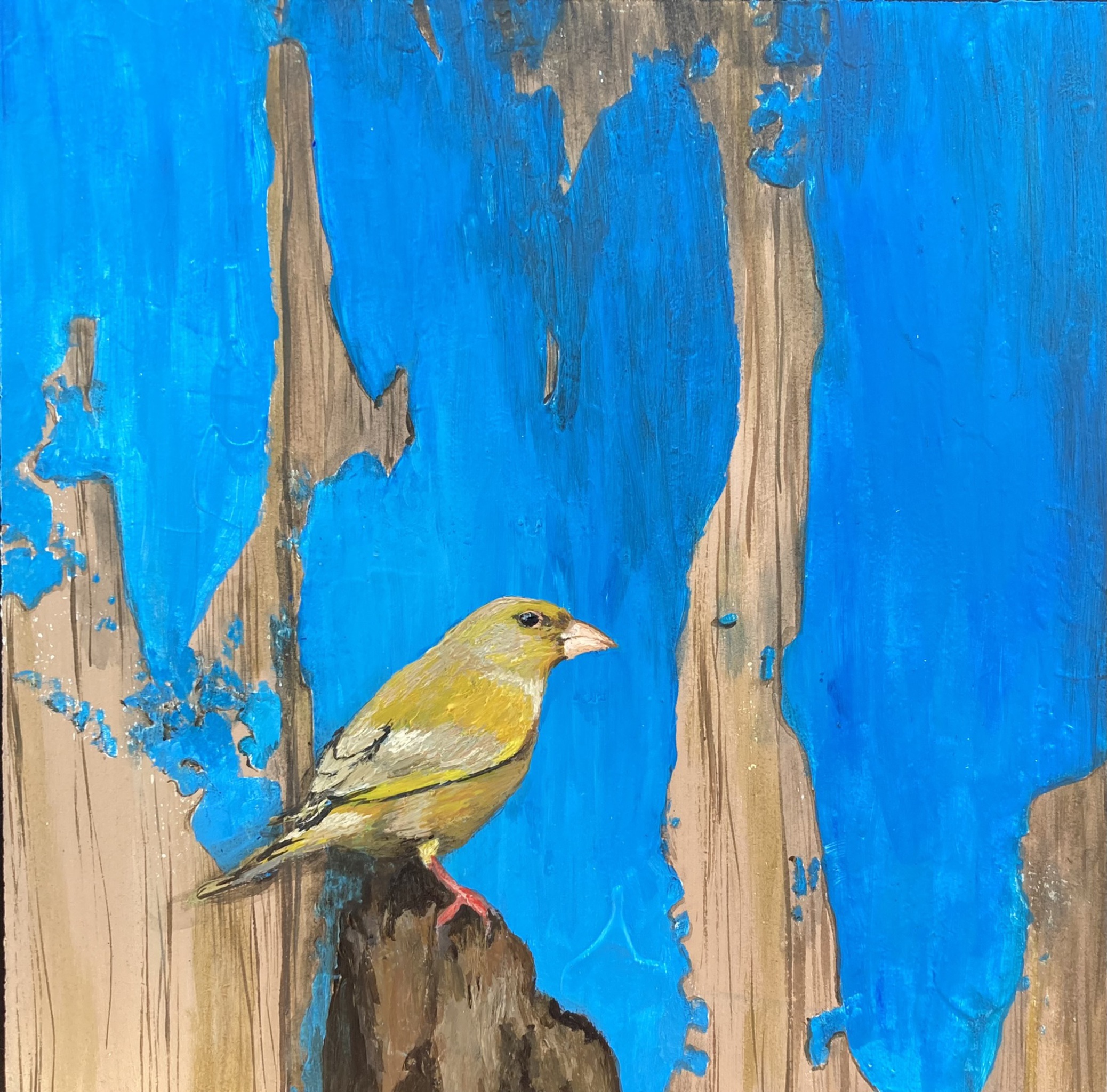 Een serie vogels uit de Nederlandse natuur, geschilderd op mdf met acryl. De achtergrond lijkt een blauwe afgebladderde houten wand. Op de voorgrond zit een kleine vogel, soms op een tak met besjes, soms op een spijker of en takje. Groenling