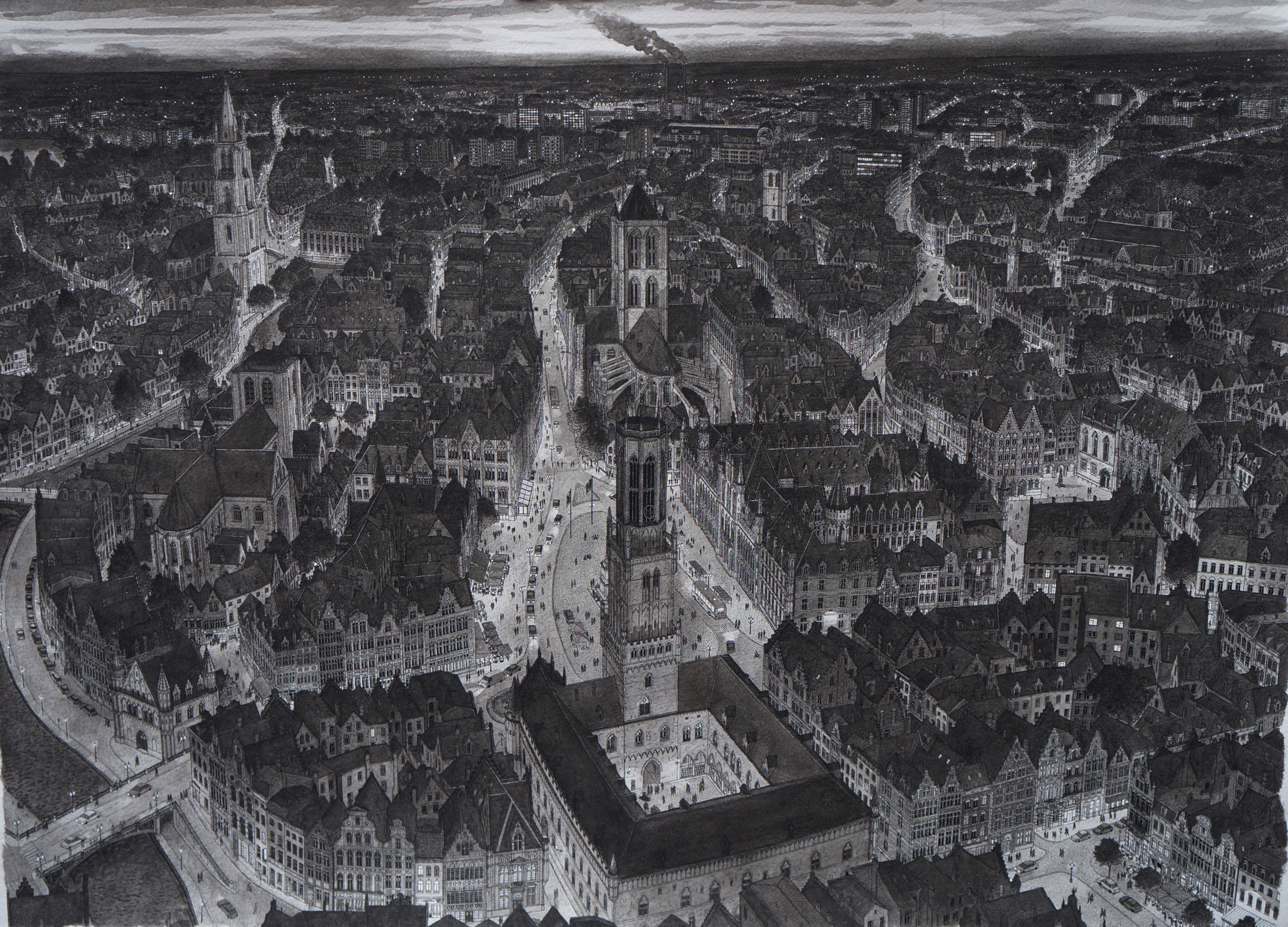Imaginaire stad in Vlaanderen gezien bij schemering. De architectuur en opbouw zijn sterk op Gent en Brugge gebaseerd.