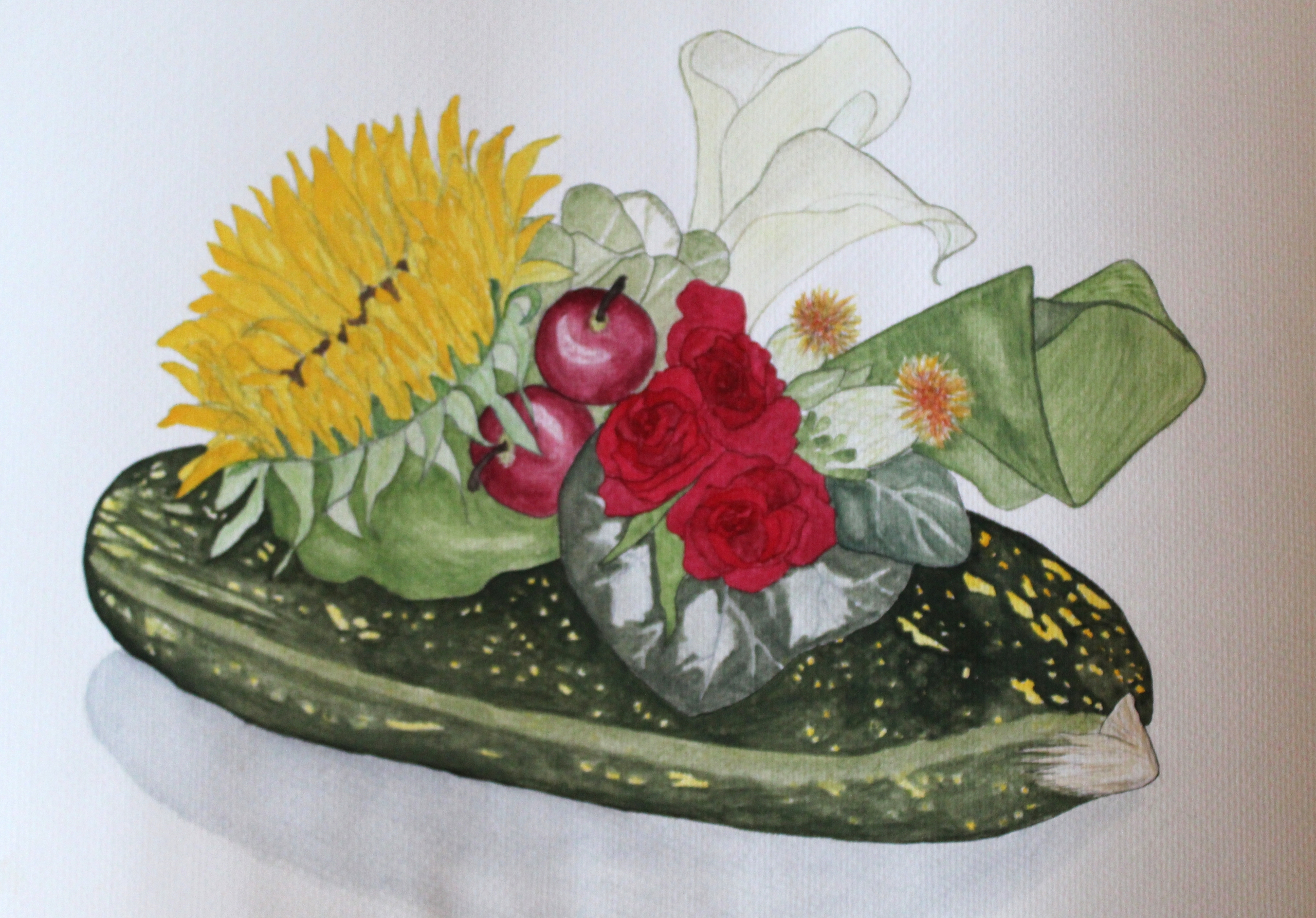 Een bloemstuk op een kalabas geschilderd met de aquareltechniek