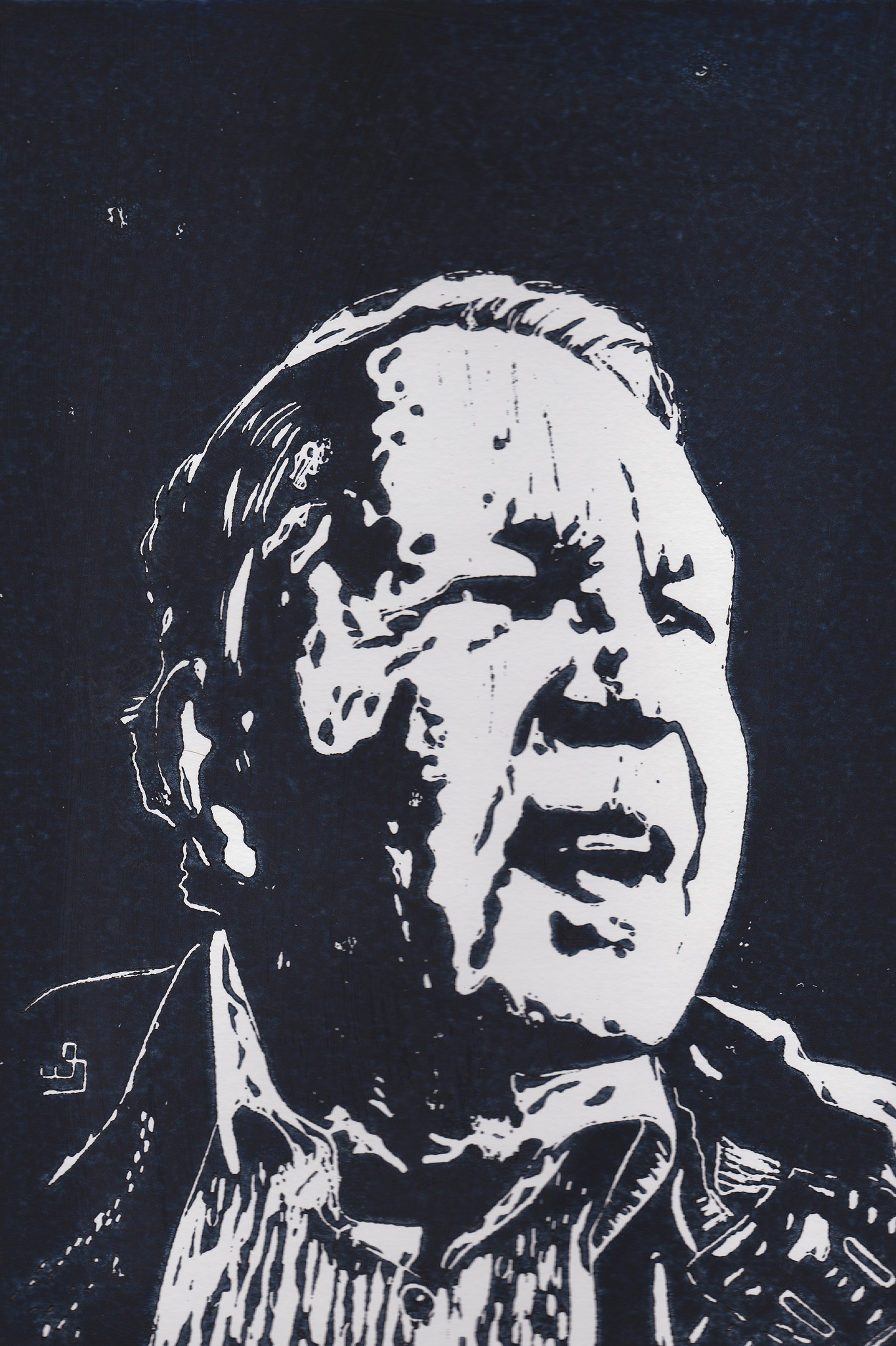 Portret ivan HvO. Lino snede gedrukt in inkt op 250 g/m2 papier Afbeelding 30 x 20 cm Papier 35 x 27 cm Kan op aanvraag op ander papier worden gedrukt en eventueel in andere kleur.