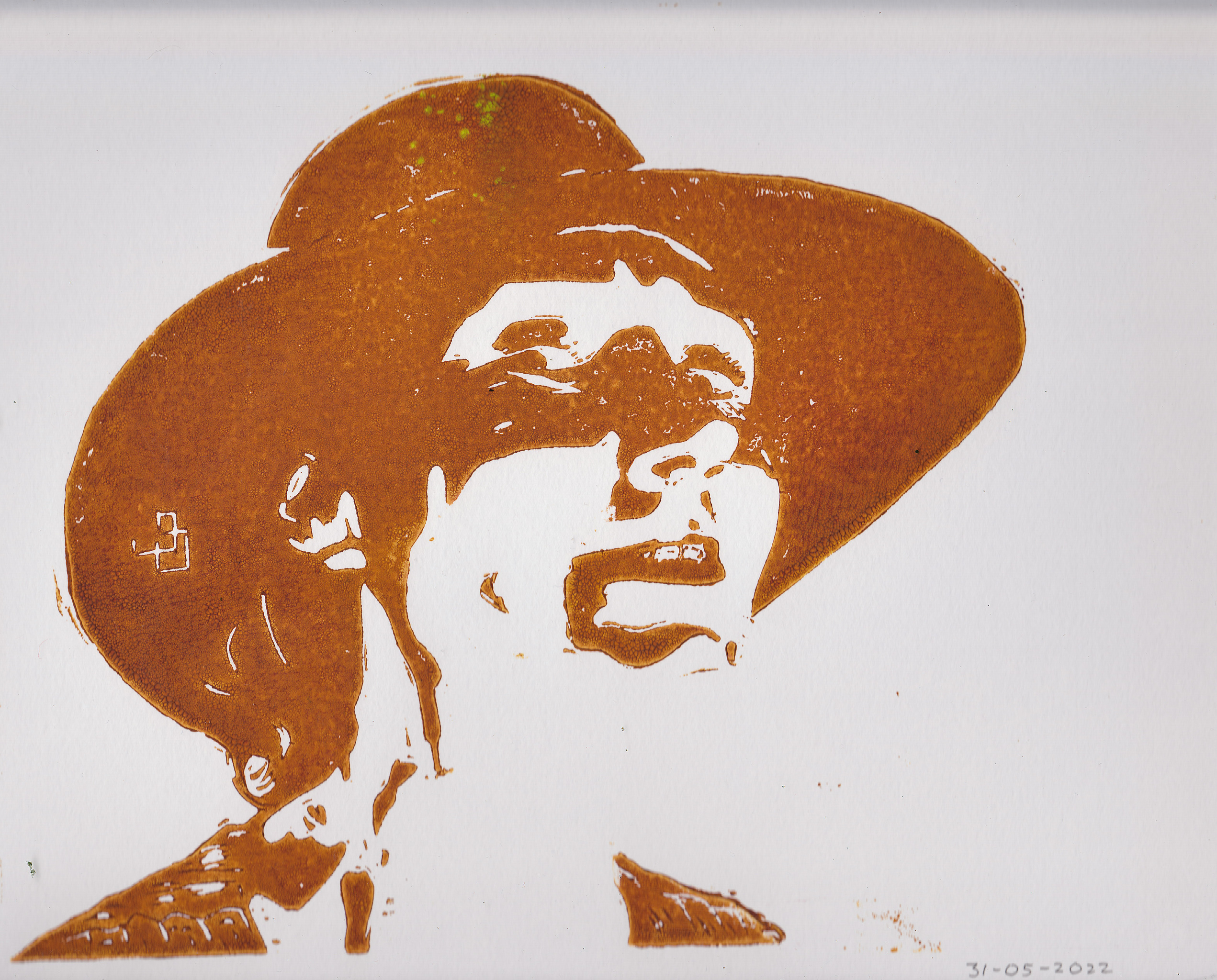 Portret van MvO met hoed. lino snede gedrukt in inkt op 240 g/m2 papier. Afbeelding 22 x 24 cm Papier 35 x 27 cm Kan op aanvraag op ander papier worden gdrukt en eventueel in andere kleur.