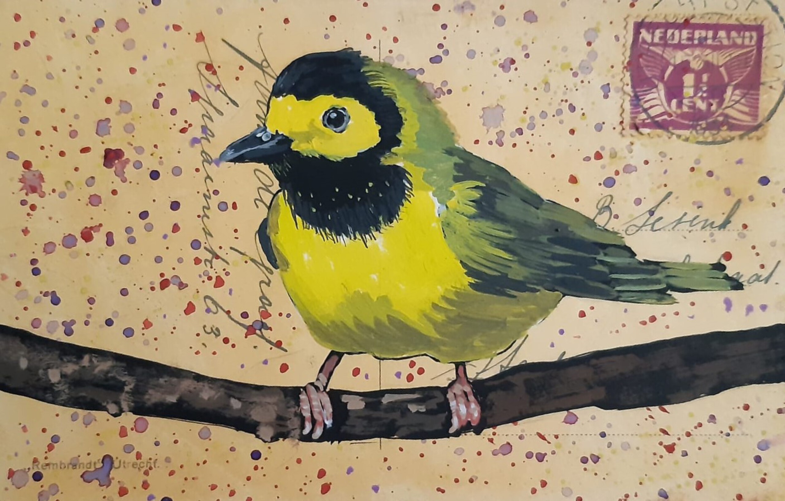 Boefje is een vogel van het Amerikaanse continent, bekend als 'yellow hooded warbler' (zeg maar: de gele zanger met een hoodie). Ik vind het net alsof hij een maskertje draagt. Vandaar de titel Boefje. Deel van de serie "Vogels in Gouache" - op oude ansichtkaart. Hij is niet de eerste vogel die op mij een boevige indruk maakt; vandaar Boefje 3. Geschilderd naar een foto -beschikbaar gesteld door de fotograaf (op twitter bekend als) @jhonny68. De vogel is realistisch - de omgeving een vrije impressie. Geschiedenis. Op een oude ansicht (vintage postcards). Gezien de postzegel van anderhalve cent is de kaart verzonden eerste helft 20e eeuw. Precies weet ik het niet. De stempel is moeilijk te lezen. GERESERVEERD VOOR ONLINE VEILING eind 2024