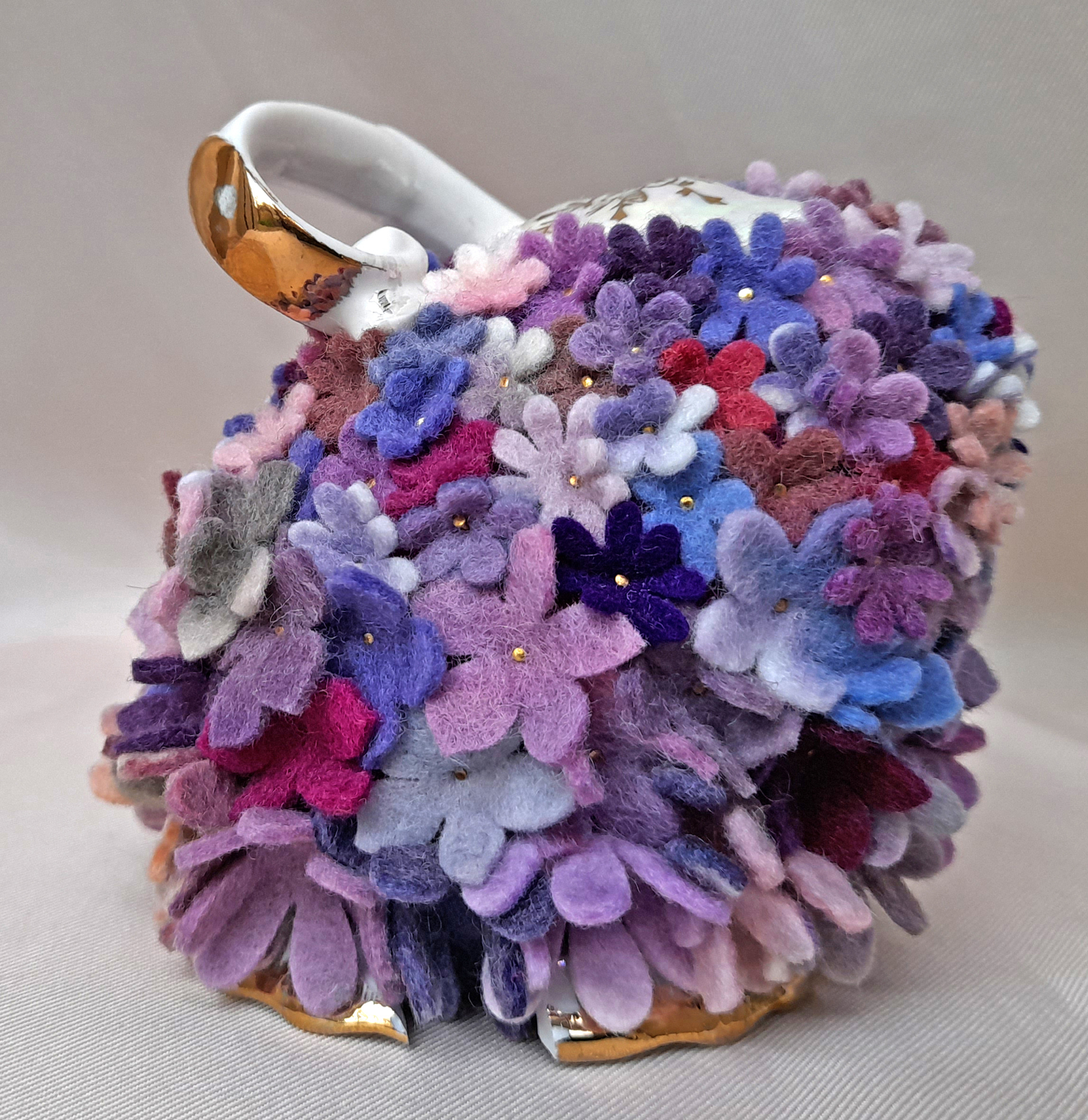 Deels handgeverfd wol vilt, keramiek, borduurzijde, kopspelden, foam.