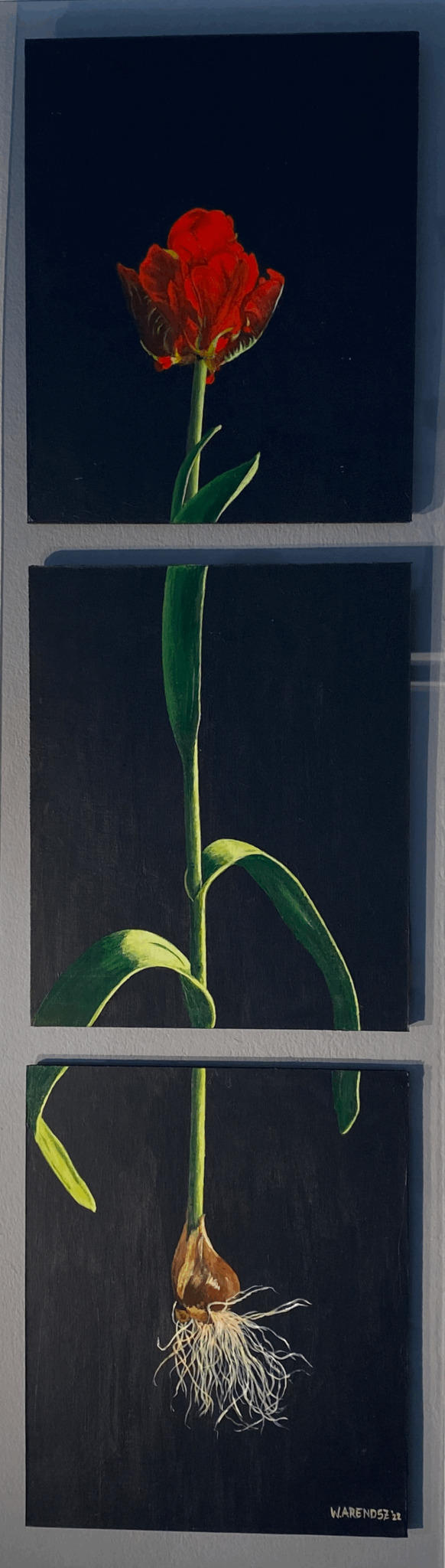 Drieluik van een papegaaitulp met bol. Op paneeltjes, die zijn bevestigd op lichtgrijs perspex.