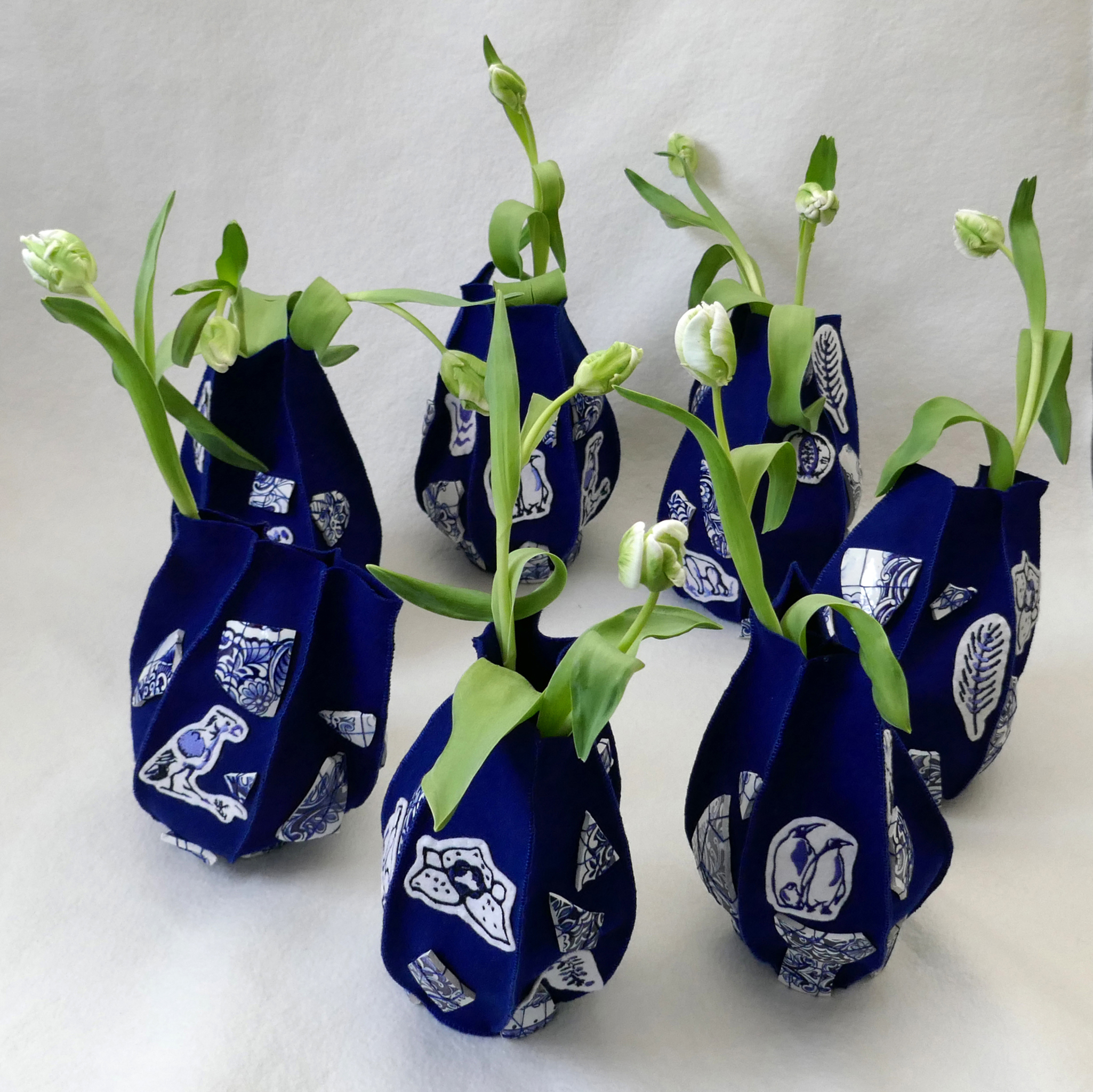 vilt, keramiek, borduurdzijde, glasngaren, glas. Delfts blauwe keramische oude vazen waren het uitgangspunt van deze serie. De originele vazen zijn gebruikt om het basispatroon te maken van de vilten vazen. Erop zijn stukken van de originele vazen gebruikt. Het aantal vazen is het aantal continenten van de wereld. De borduurwerken zijn afgeleid van de planten en dieren die landen gebruiken als symbool. Er zijn maar enkele symbolen nodig, om de continenten / landen van de wereld “samen te vatten”. Deze symbolen zijn ook terug te vinden op oud Hollandse tegeltjes (uit de periode van de Delftse pronkvazen). Deze geschilderde symbolen op de tegeltjes zijn weer, door mij, omgezet tot borduurpatronen. Iedere vaas bevat meer symbolen, dan nodig zijn, om de wereld te “vertegenwoordigen”. Alle kapotte onderdelen en alle symbolen vormen een zachte scheve wiebelige vaas, maar het geheel is tóch bruikbaar als vaas. (Los te koop, deels verkocht.)