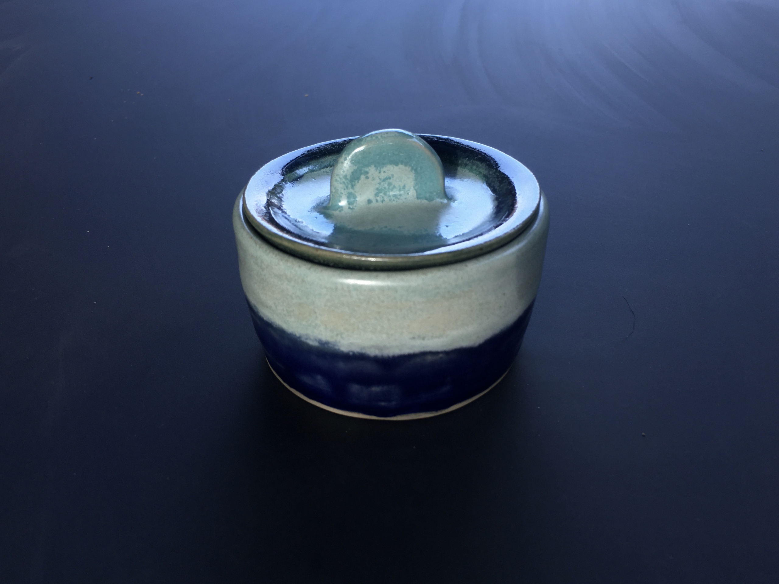 Steengoed doosje/potje met deksel. Handgedraaid en geglazuurd. Kleuren mint groen en kobaltblauw. Uniek gebruiksvoorwerp, geen serie. Ik ben beeldende kunstenaar en vind interessant om keramiek in mijn werk te gebruiken. Daroom vind ik leuk om unieke objecten en gebruiksvoorwerpen ontwerpen en vervaardigen. Deze schattig doosje/potje en andere gebruiksvoorwerpen zijn schetsen in keramiek om vormen en glazuren te testen. Daroom zijn ze uniek en er is maar een van elk exemplaar.