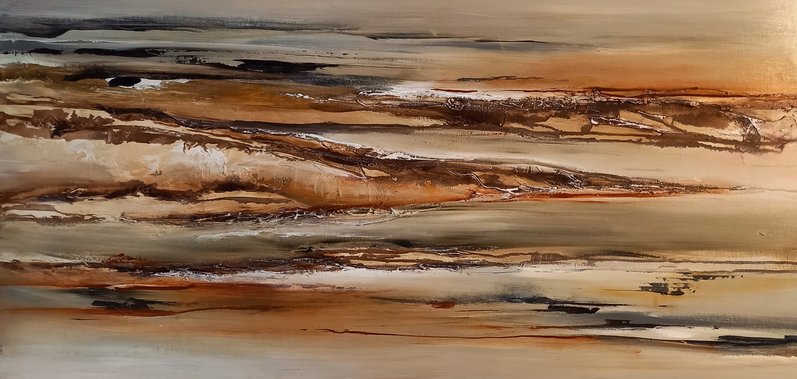 Acrylverf op linnen. Mixed Media met o.a. structuurpasta en acrylinkt. Abstract in aardetinten