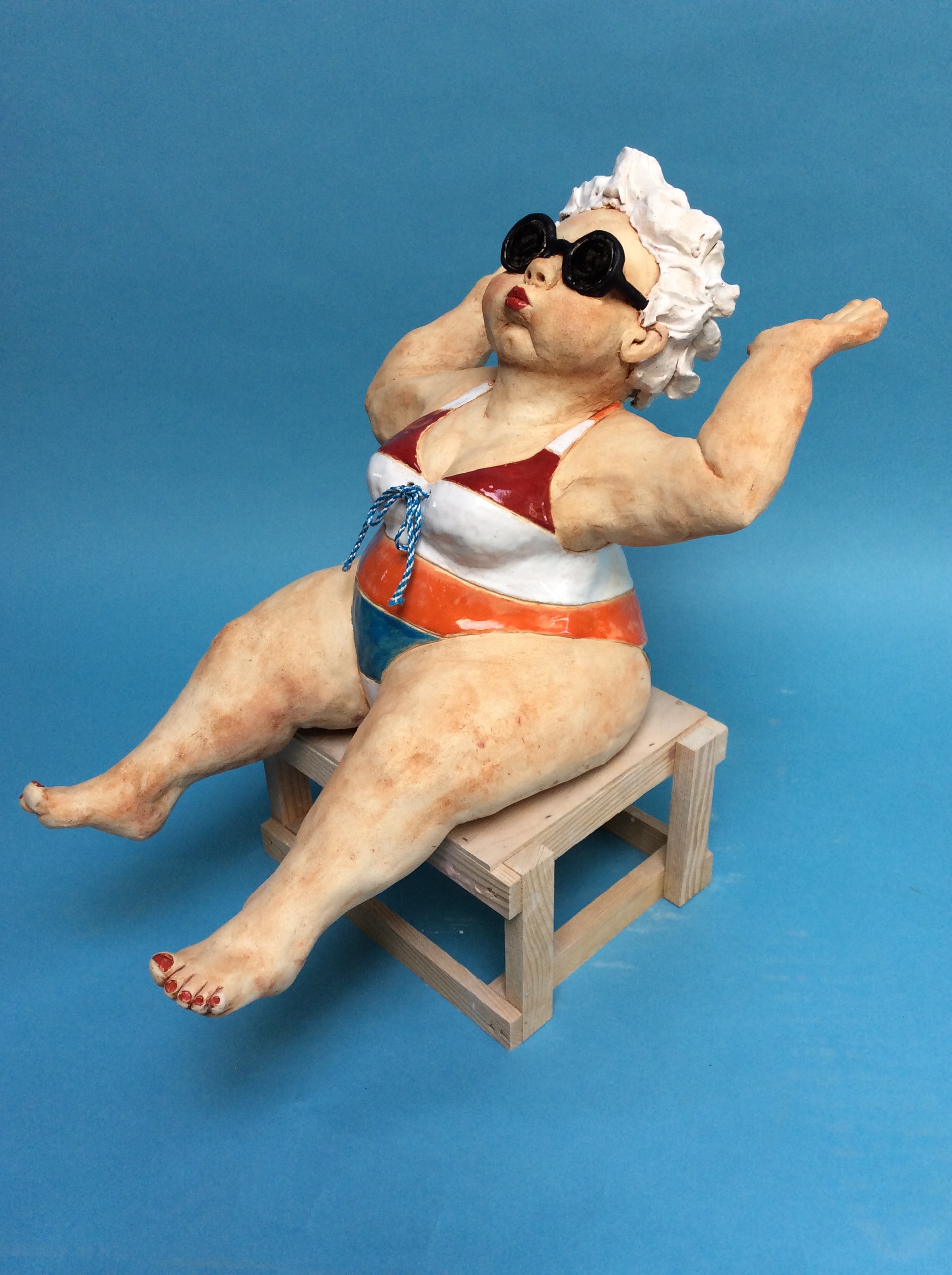 Vrouw in badpak. Keramiek afgewerkt met glanzende en matte glazuur