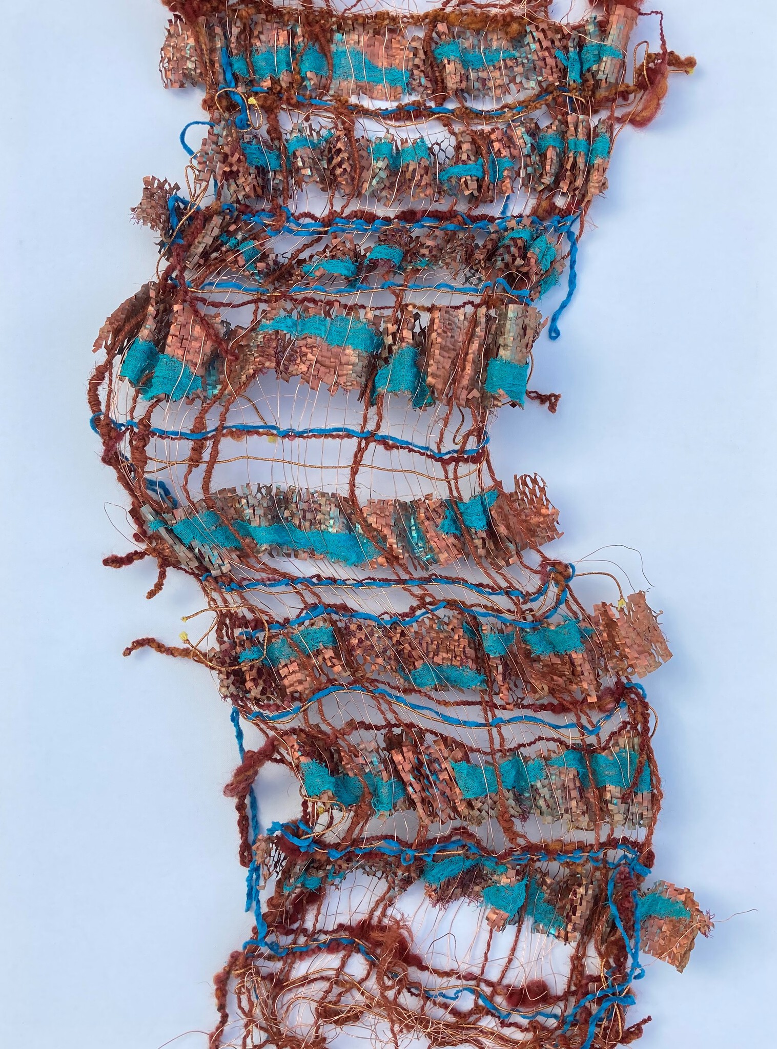 Weefwerk met koperdraad papier en handgesponnen draden.