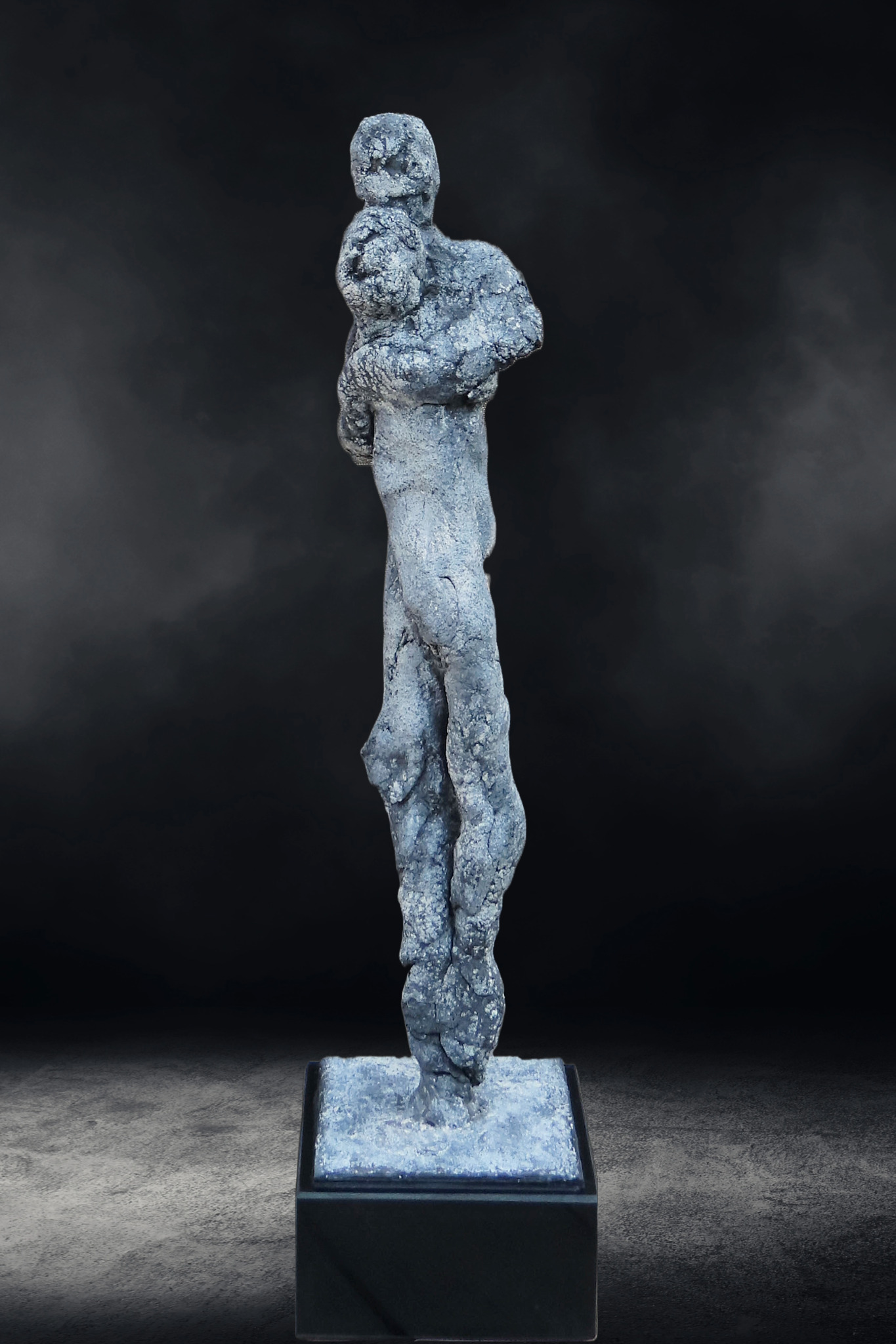 - VERKOCHT- Melting together...connecting....as one. Een beeld van klei, gemaakt van paverpol (loodkleur), artstone en paversand. De afmetingen van het beeld zijn exclusief sokkel, de zwart marmeren sokkel meet 10x10x5 cm.