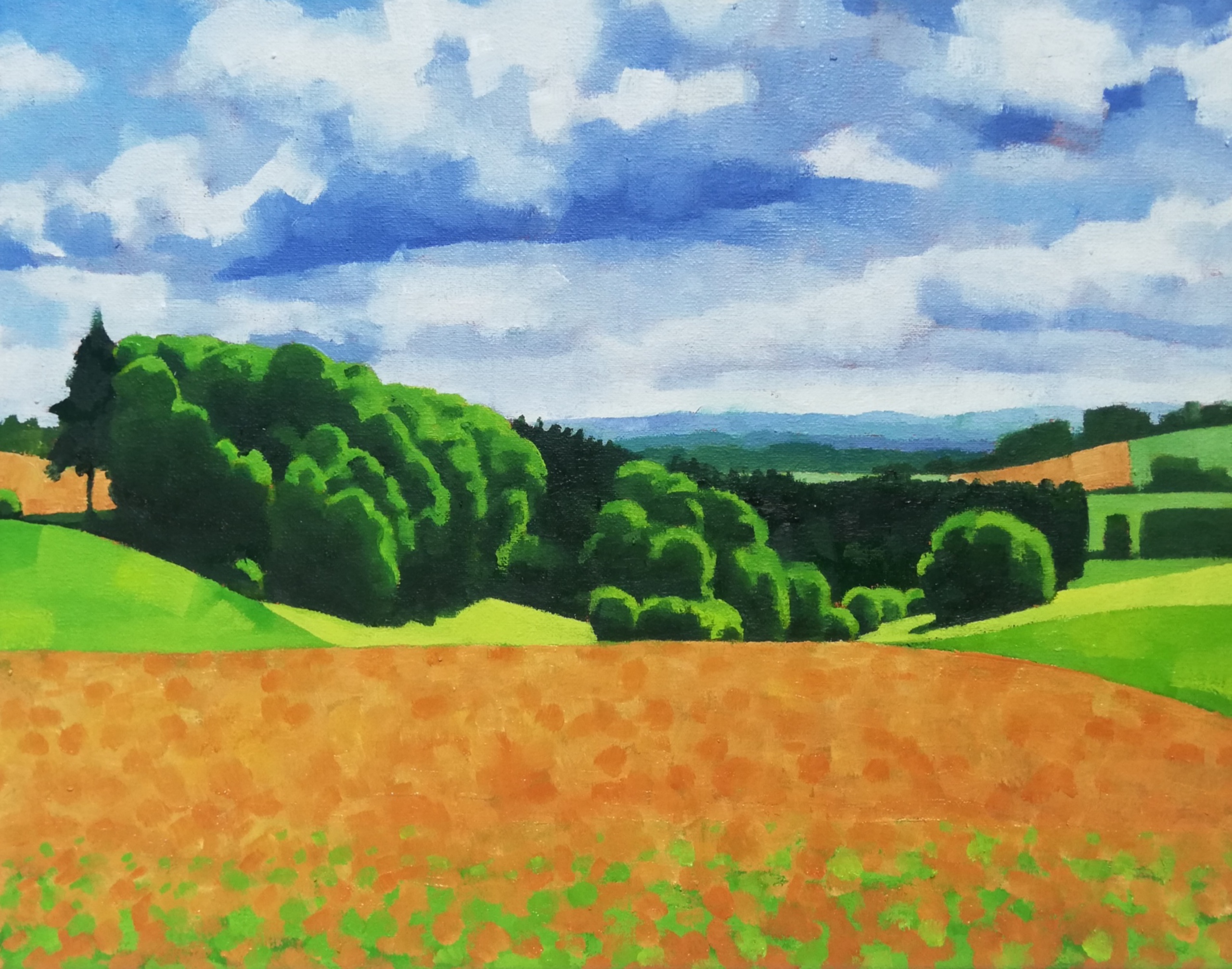 Vorig jaar heb ik een serie schilderijen gemaakt van de Eifel. Wat me aanspreekt zijn alle verschillende tinten groen en de lappendeken aan gekleurde velden die je daar in de lente aantreft. De Eifel is een bijna abstract landschap met verschillende overzichtelijke lagen en glooiende lijnen dat zich uitstekend leent tot stylering.