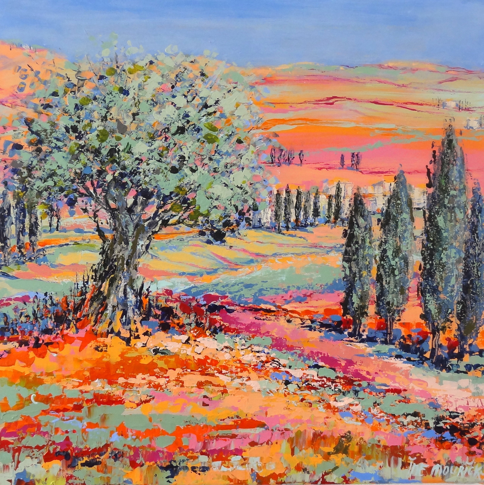 Cipressen en een oude olijfboom in een kleurrijk zuidelijk landschap. Mijn inspiratie: de zuidelijke landschappen van Italië, Griekenland of Spanje. De kleuren van de velden, de blauwe luchten, de kleine dorpen met oude huizen zijn een belangrijke inspiratie voor mij. Ook de prachtige olijfbomen en cipressen in Italië (Toscane), die dat landschap zo veel karakter geeft. Inclusief houten baklijst in de kleuren zwart en zilver.