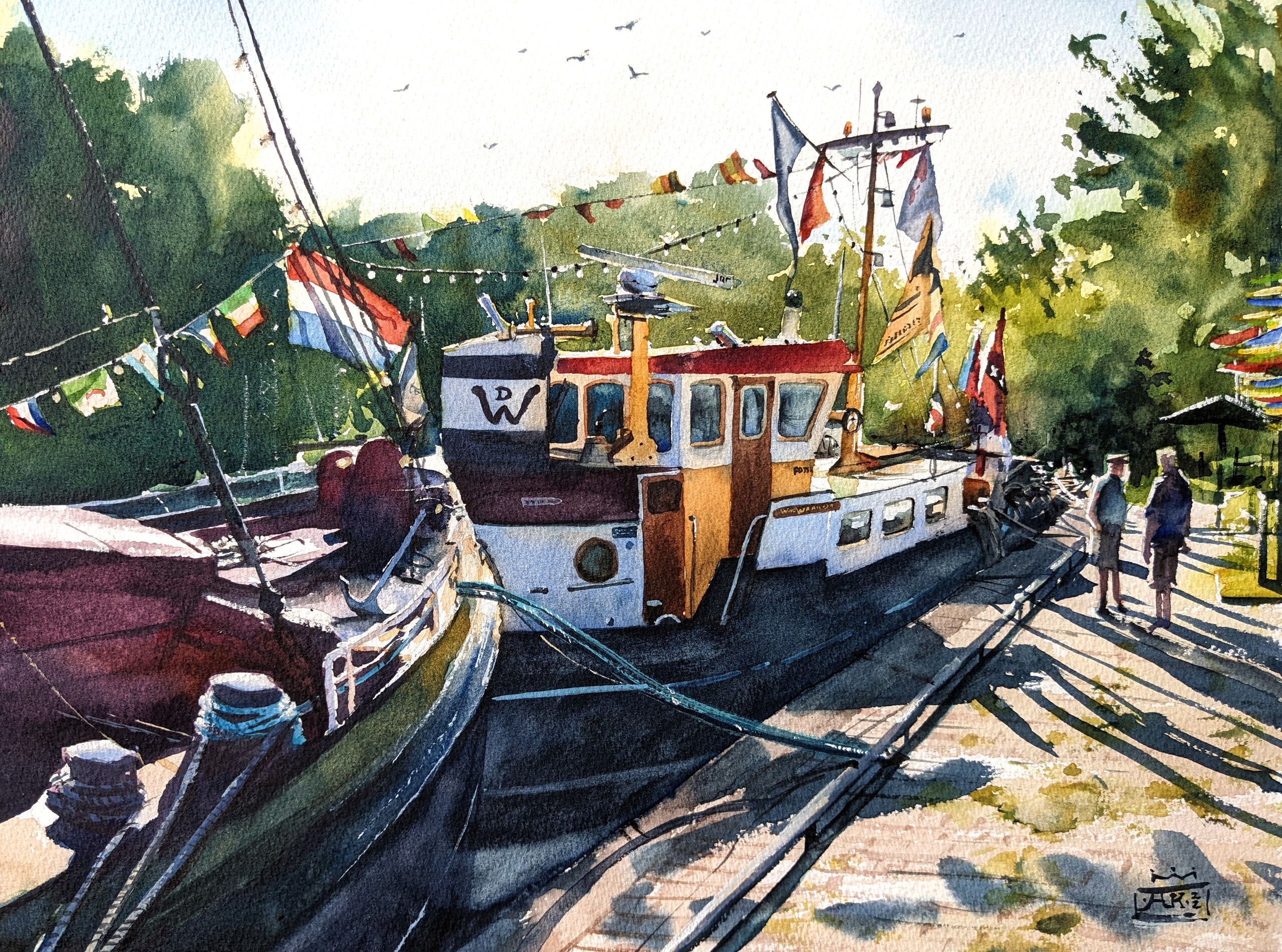 Aquarel Realistisch Watercolor Haven Boot Schip Boten Schepen Sleepboot Impressionistisch Bootjes Boats Nautisch Havendagen