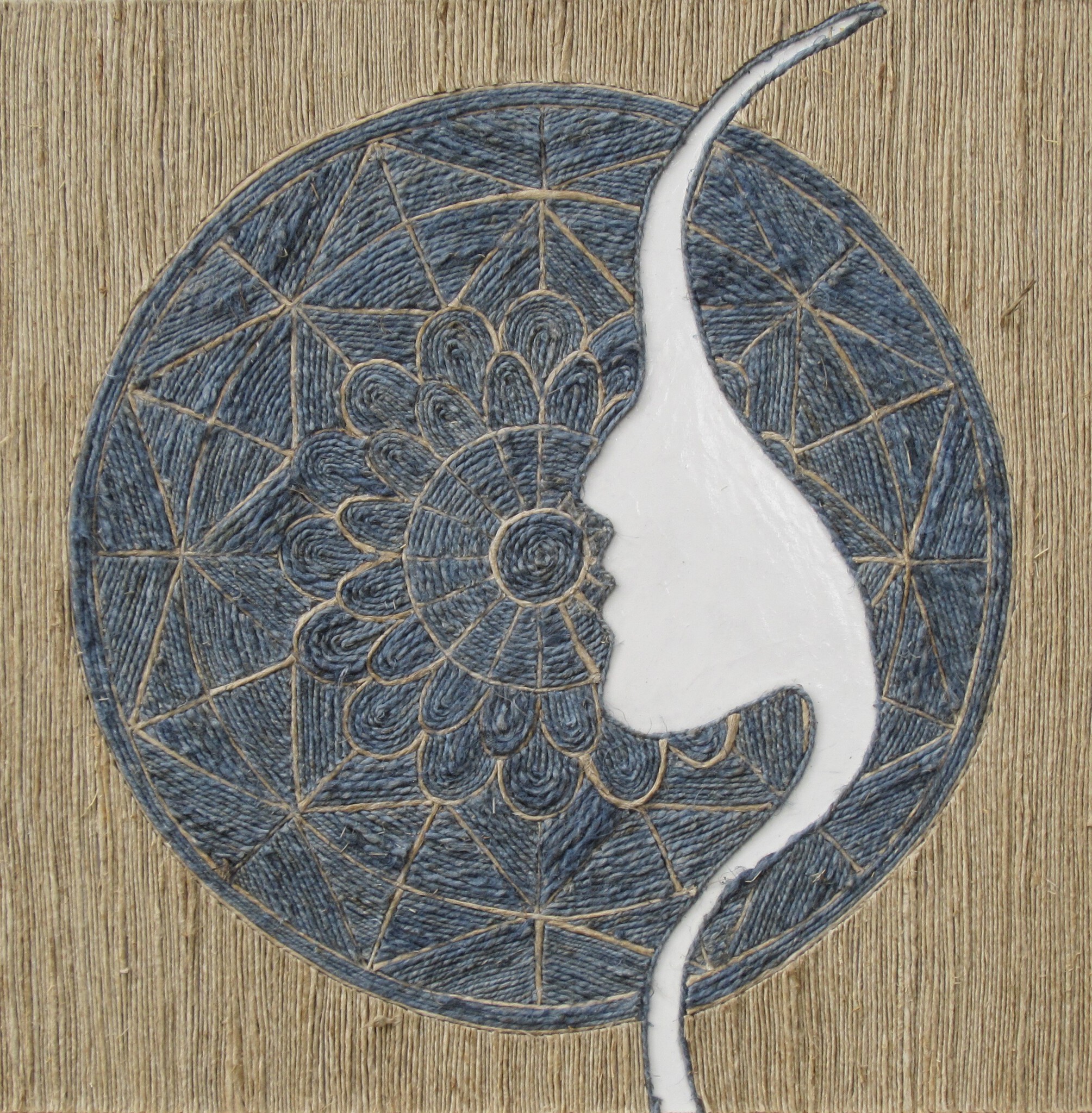 Mandala gemaakt van vlastouw in twee kleuren met een silhouet van een vrouw erin verwerkt.