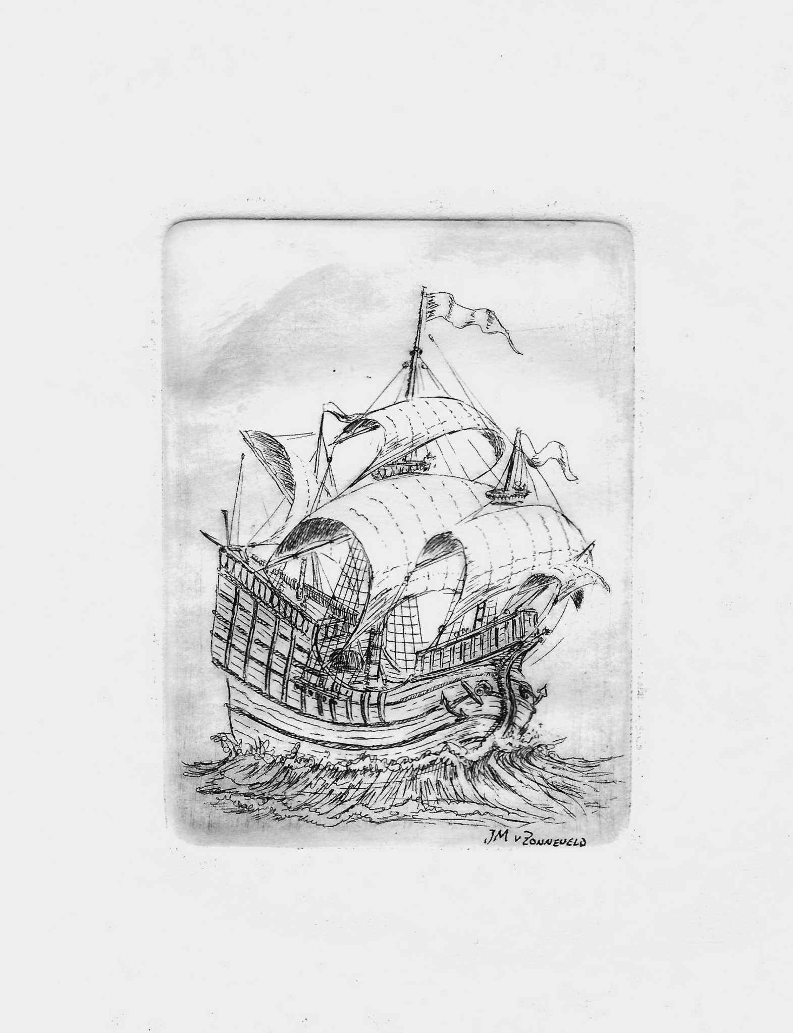 Een 16e eeuws zeilschip geëtst in zinken plaat en afgedrukt