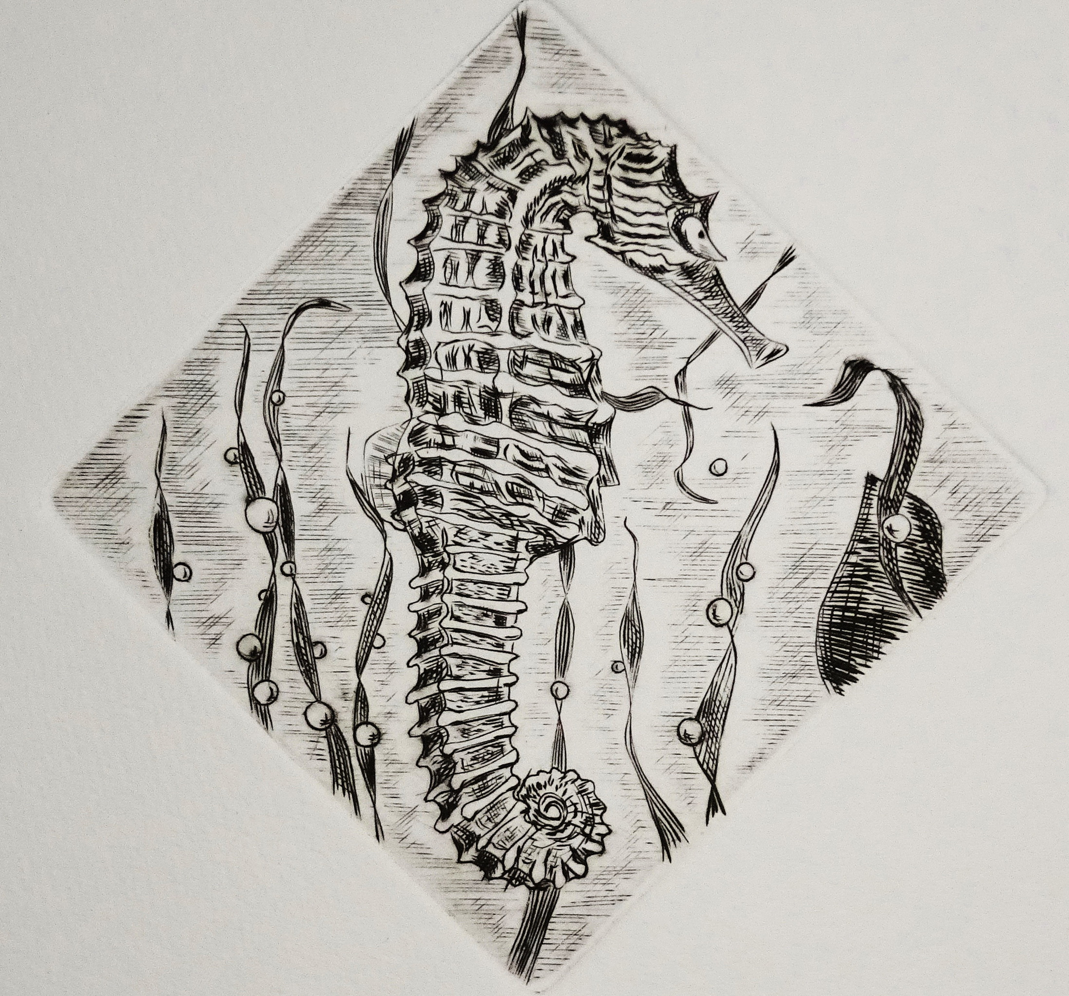Zeepaardje, kopergravure Afmetingen zijn van de drukplaat en diagonaal