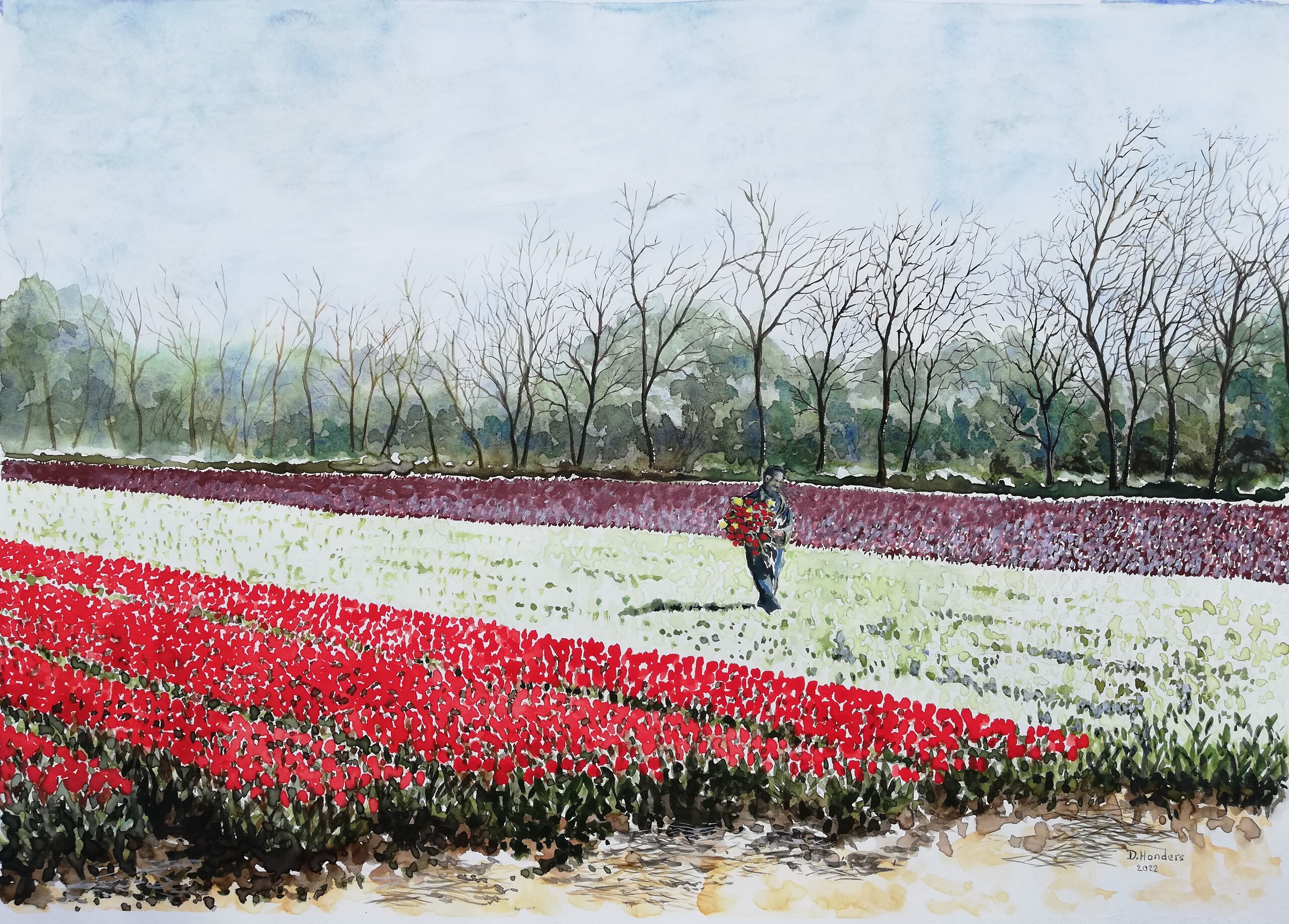 De ziekzoeker aan het werk in de bollenvelden van Lisse. Locatie waar deze aquarel gemaakt is was bij de Loosterweg zuid.