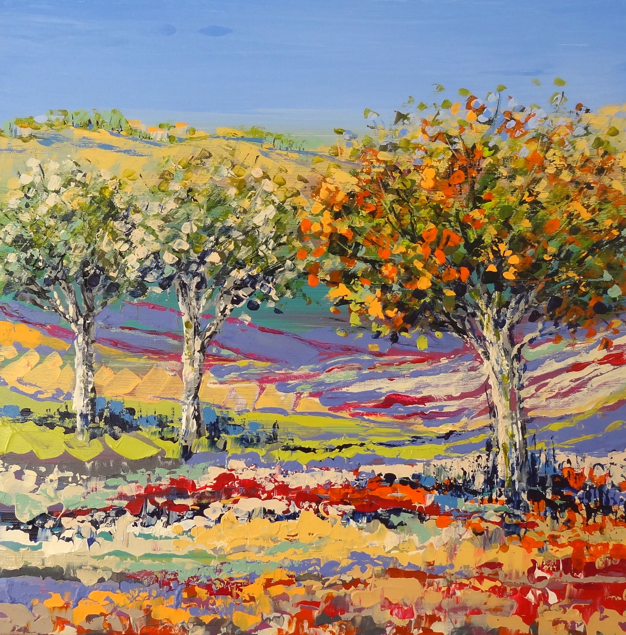 Zuidelijk impressionistisch landschap met een sinaasappelboom, grapefruitbomen in kleurrijke velden. Mijn insipratie: de zuidelijke landschappen. In Spanje en Italië zag ik de prachtige sinaasappel en grapefruitbomen, vol met fel oranje sinaasappels en gele grapefruits tussen de donkergroene bladeren. De zijkanten van het schilderij zijn meegeschilderd. Ingelijst in een houten baklijst in de kleuren zwart en zilver