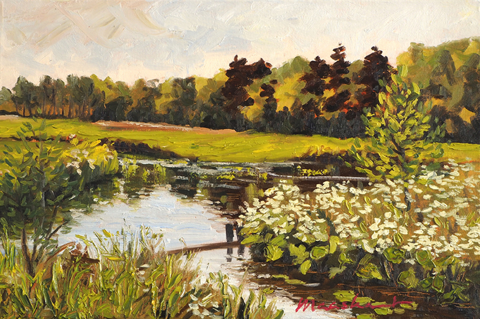En-plein-air geschilderd zicht op het Mastbos bij Breda. Gezien vanaf de brug over de Mark in de buurt van de boerderij van SBB. Ook de plek waar elk jaar ooievaars broeden en jongen grootbrengen.
