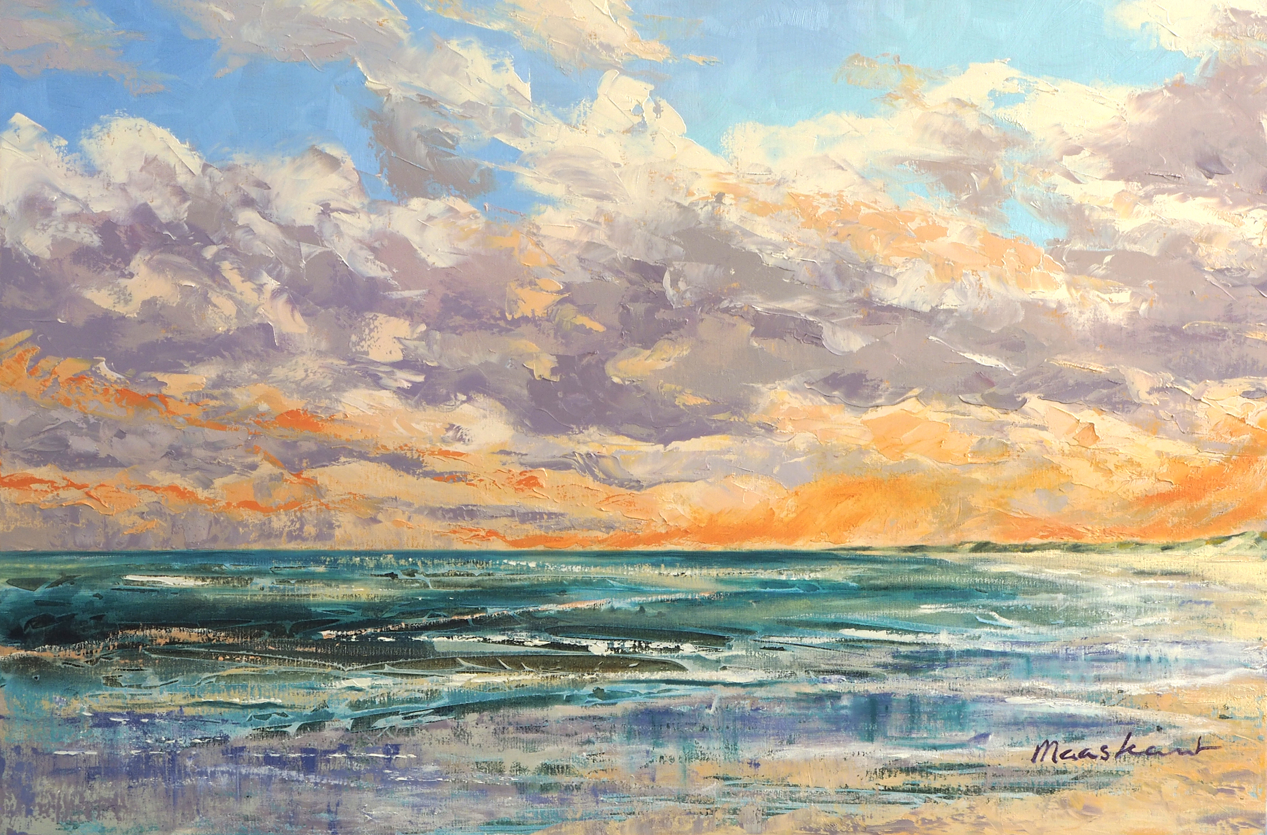Schilderij Zee Strand Zonsondergang Olieverf Kust Zeeland Wolkenlucht Terschelling Avondlicht Margot Maaskant