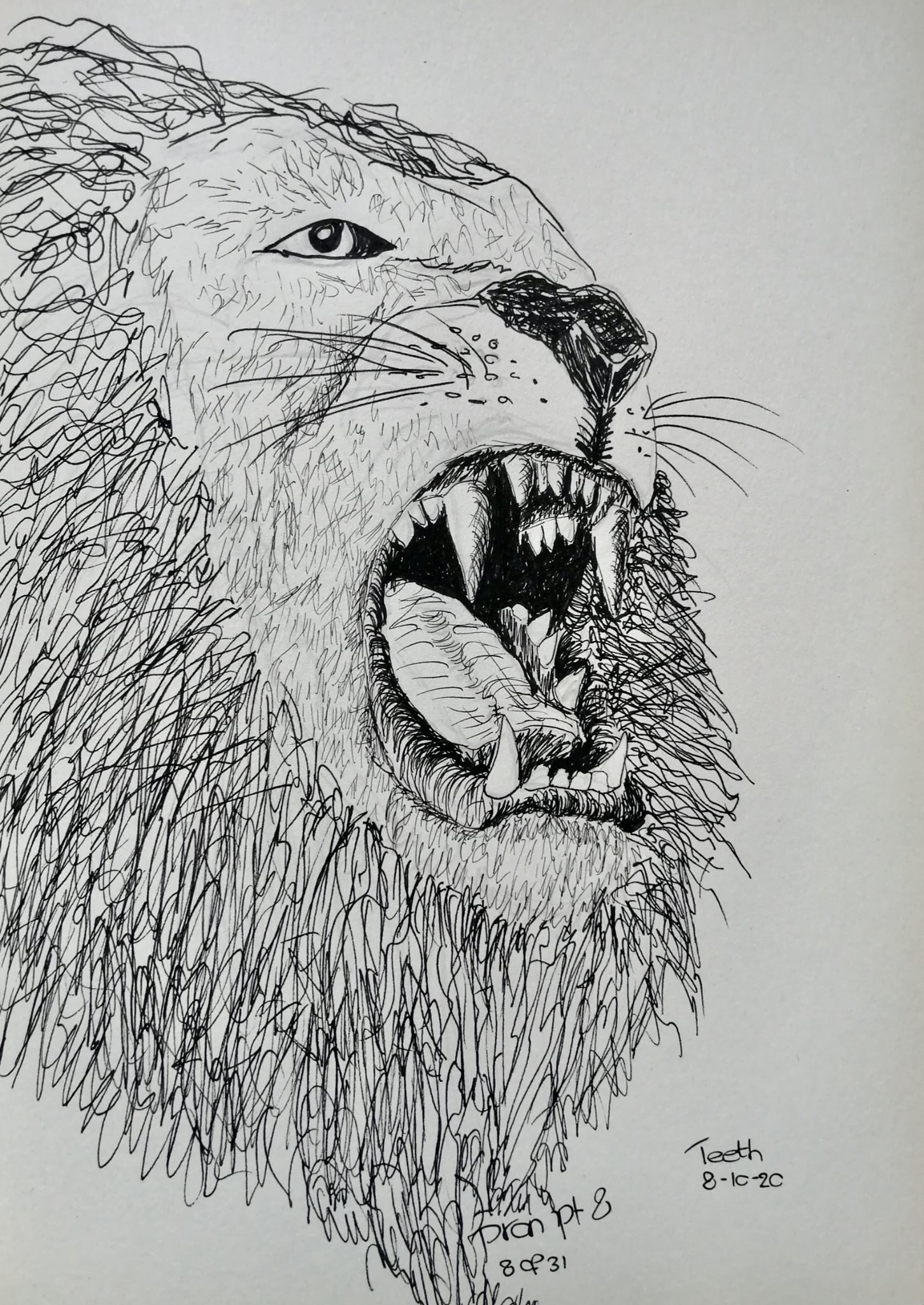 Tanden. Veel dieren hebben tanden. Sommige scherpe, andere om te kauwen. Als het op dieren aankomt dan denk ik bij tanden, aan scherpe tanden. Mede omdat ik een leeuw ben van sterrenbeeld. Deze tekening was dus niet zo lastig om op te komen.