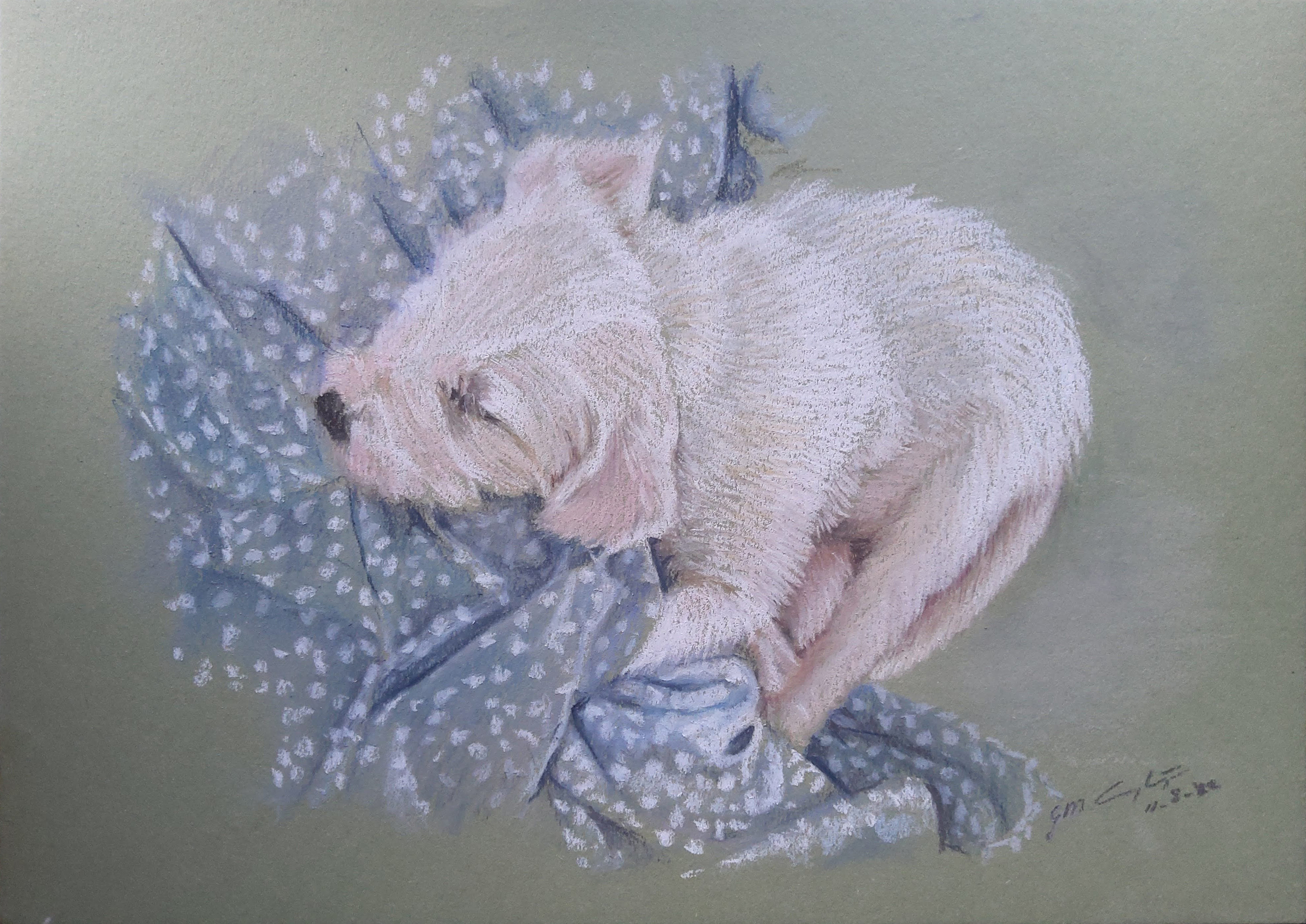 In reactie op een opdracht, had diverse foto's gekregen, wist nog niet wat de vraagstelling was, dus ben gewoon aan iets begonnen dat ik leuk vond om te doen. Een puppy op de schoot van iemand. Het bleek een toevallig meegezonden kiek te zijn. Maar het leverde mij een leuke pastelpotlood studie op.