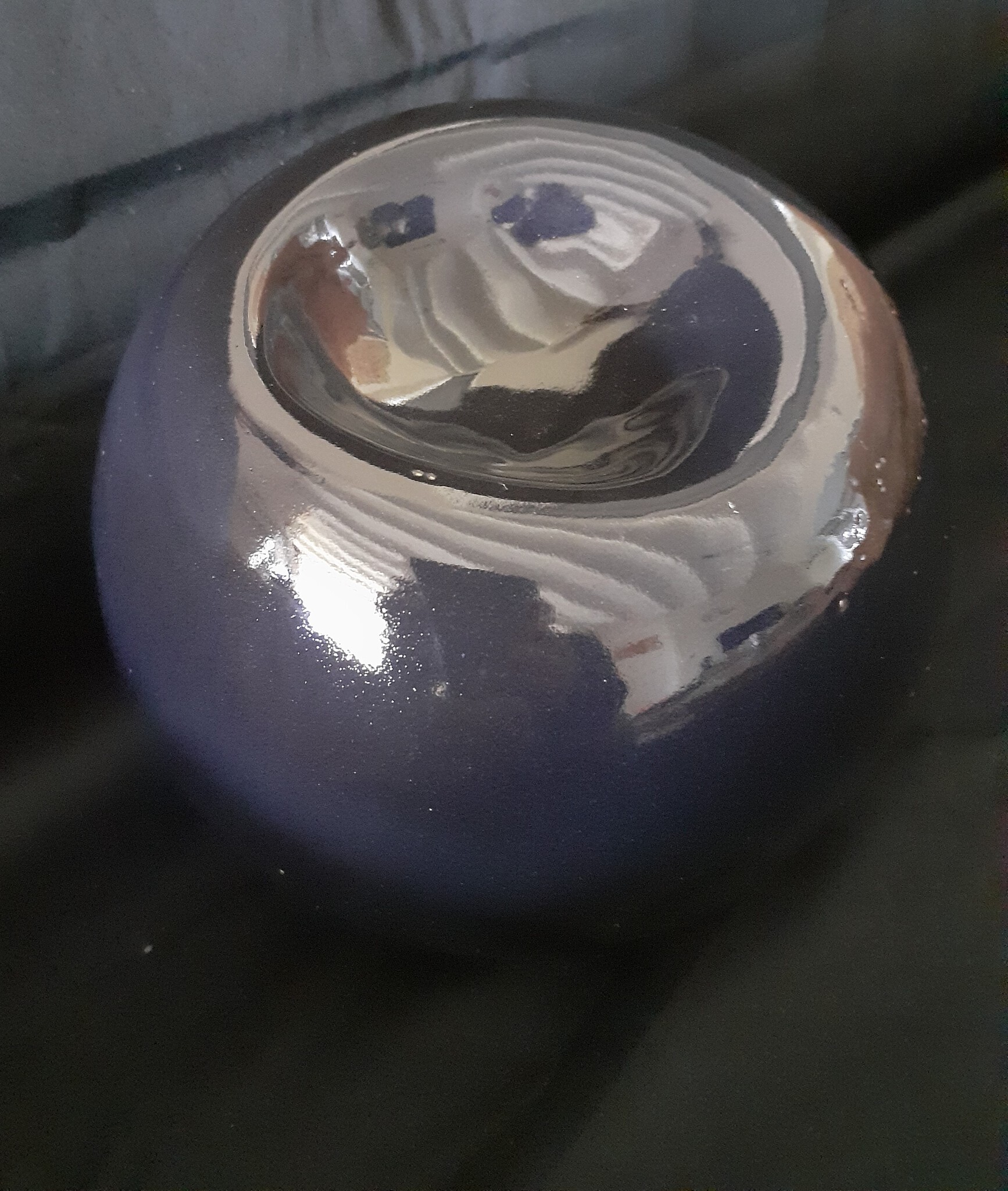 Deze ingedeukte bol is gemaakt van klei en zwarte glazuur. Ik geef hiermee weer dat de coronatijd veel invloed heeft gehad op het dagelijkse leven.