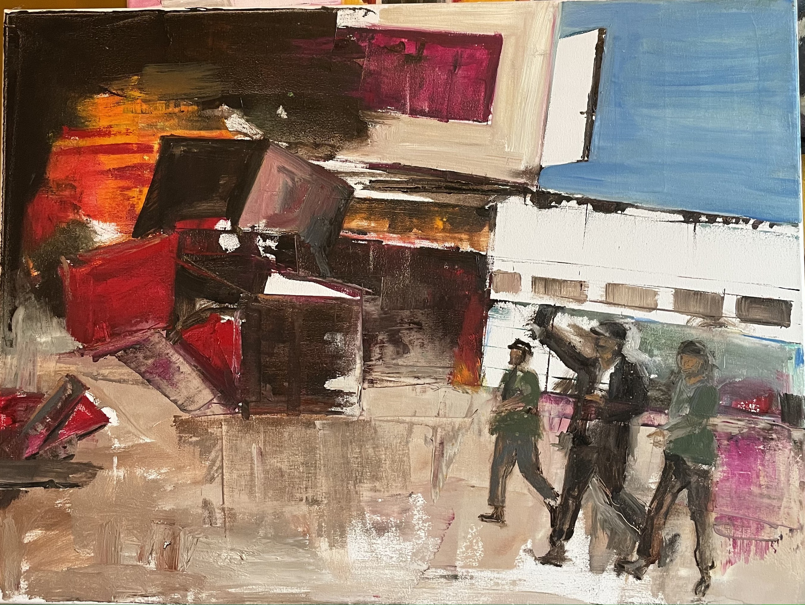 Mijn naam is Catherine Noë. Zo'n 10 jaar geleden ben ik begonnen met schilderen. Ik schilder wat me raakt, op de meeste doeken komen mensen voor of straatbeelden. Ze wekken bij mij nieuwsgierigheid op, wat is er allemaal gebeurd in deze straat, wie is deze persoon, waar gaat hij naar toe, heeft hij een gezin, een spannend leven, een geliefde...? Los van het beeld vind ik kleurgebruik belangrijk, ik doe dat intuïtief daarmee creëer ik een meer sprekend doek.