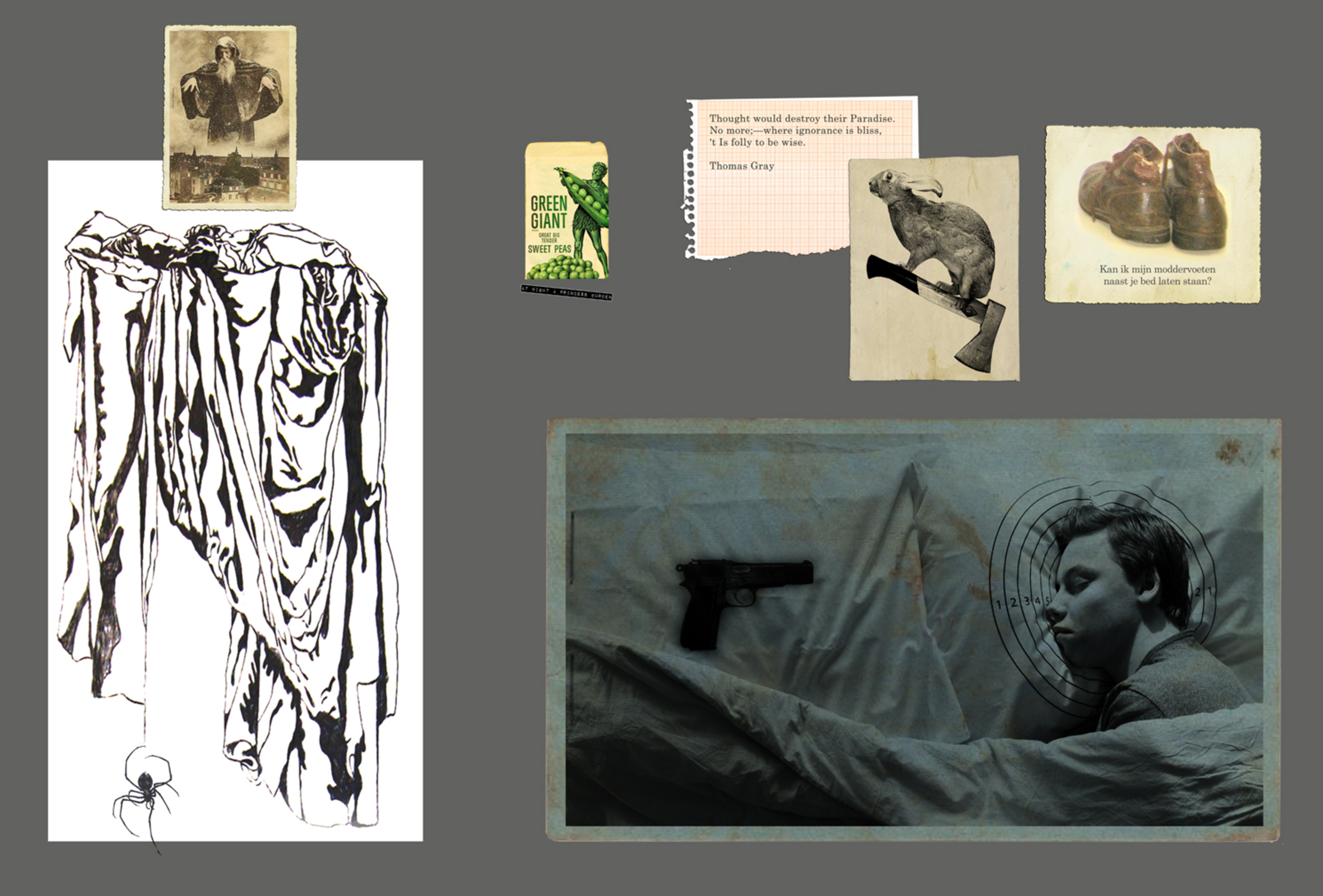 In dit werk verbeeld ik mijn spanning tussen angst en wegkijken: Brengt Klaas Vaak de vergetelheid of laten we ons zand in de ogen strooien? Zijn kleinzielig of edel wanneer we klagen over de erwten onder ons matras? En wat doen we als we ons daar persoonlijk toe moeten verhouden? Het meest persoonlijke element, in dit werk, is de foto van mijn zoon. Ik wilden hem, als jonge man, tonen als doelwit en als potentieel dader. De schets en de voorbereiding voor de shoot deed ik als kunstenaar, maar het vast leggen van mijn angst was lastig want als moeder wil ik ook liever niet zien.