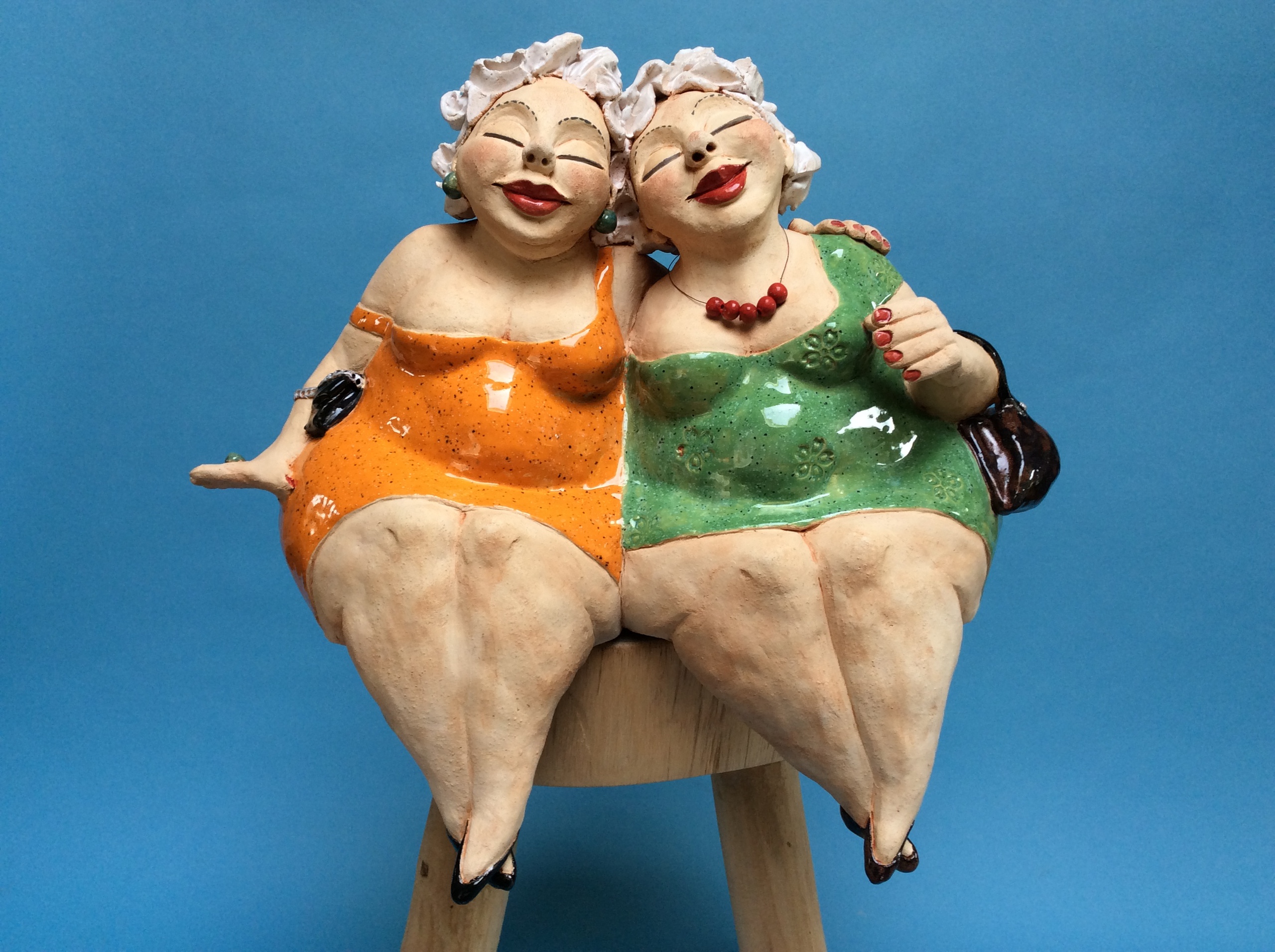 Twee dikke dames gezellig zittend naast elkaar. Keramiek afgewerkt met glanzende en matte glazuur.