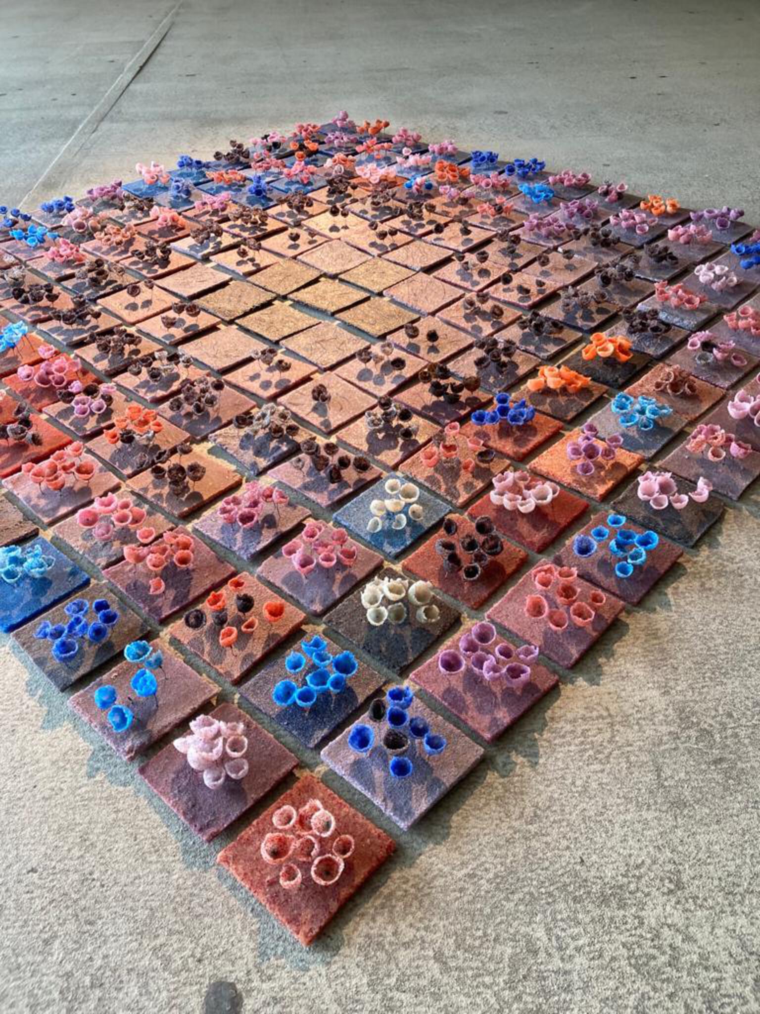 bloemetjes onderdeel van een groot geheel ze worden per stuk verkocht Mijn eigen soort bloemetjes heb ik Plienaflos (flos is latijn voor bloemen) genoemd. Ze staan op vierkantjes van verschillende kleuren die de diverse grondsoorten over de hele wereld aangeven. De vierkantjes met bloemetjes vormen een spiraal waarvan het begin - aan de buitenkant het heden is: vooral schone grond en frisse bloemetjes. Naar mate je dichter bij het middelpunt komt, de zwarte kern, wordt de grond steeds meer vervuild, de bloemetjes verliezen hun kleur en uiteindelijk zijn er nog een paar steeltjes zonder bloemetjes aanwezig: De toekomst als we geen maatregelen nemen om vervuiling tegen te gaan. De natuur is fragiel en veerkrachtig en kan door bijv. klimaatverandering verstoord raken. De techniek “pâte de verre” die kwetsbare vormen oplevert heb ik doelbewust gebruikt.