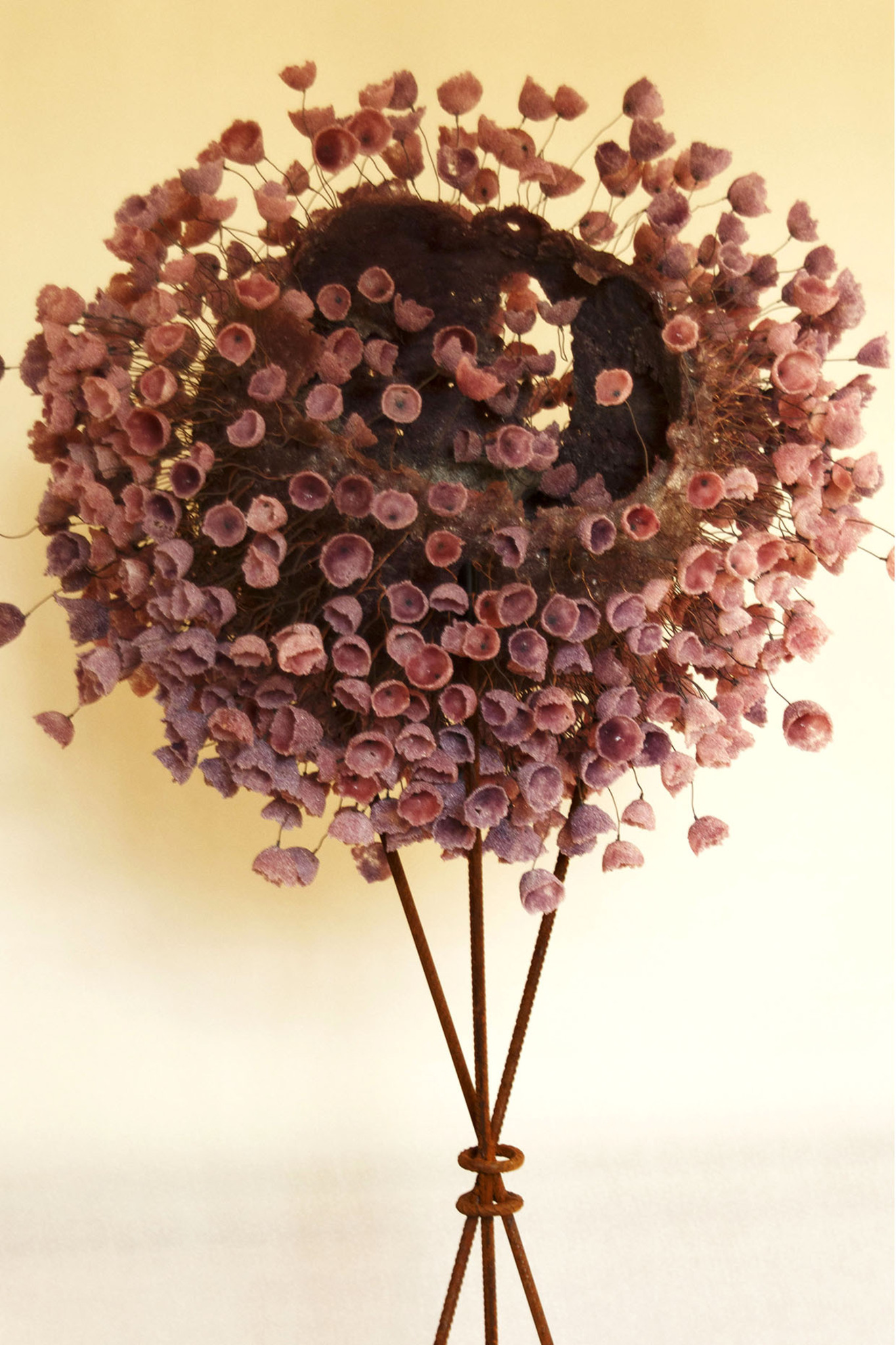 “Natuurkracht” heeft te maken met de fascinatie van hele velden vol met bloemen die altijd is gebleven. Maar die bloemen zijn bezig te verdwijnen. Ik probeer met mijn werk aandacht te vragen voor de natuurlijke bloemenpracht en de mogelijkheden die de aarde in zich heeft. De bol is een symbool van de kracht en overlevingsdrang van de natuur: Er zijn de bloemetjes in de buitenlucht aan de buitenkant en in een grot (binnenkant) waar ze zich een weg door de kieren van het gesteente een weg hebben gebaand om te kunnen bloeien, hun zaadjes te laten vallen die zullen ontkiemen tot nieuw leven. De bol die een grot/rots weergeeft is gemaakt van dik pâte de verre terwijl de bloemetjes een fragiele indruk moeten geven ook van dezelfde techniek maar dan heel dun zijn gemaakt.