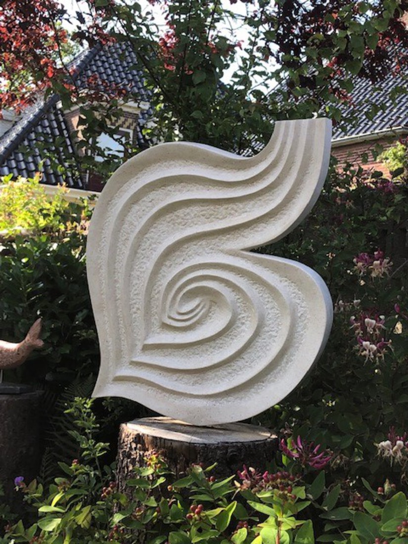 Beeld van Amant. Gemaakt uit een voormalige grafsteen. De lijnen vormen een hart en stijgen op naar boven. Verbinding in liefde met de 'mensen van voorbij' en met dat wat is als we er niet meer zijn