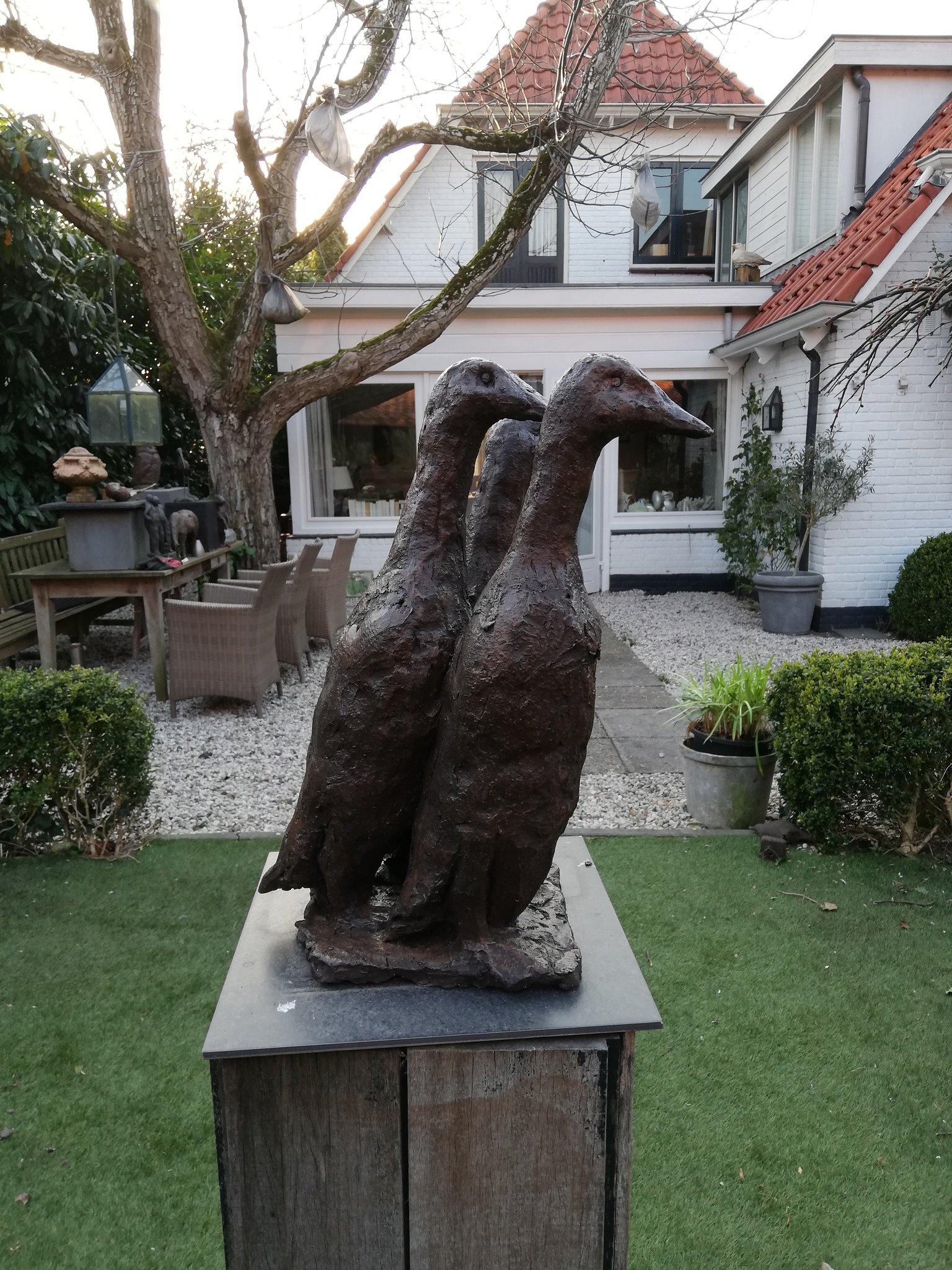 Chinese loopeenden. Charmotte klei. bewerkt en gepattineerd. Op 1200 graden gebakken. Vorstbestendig.