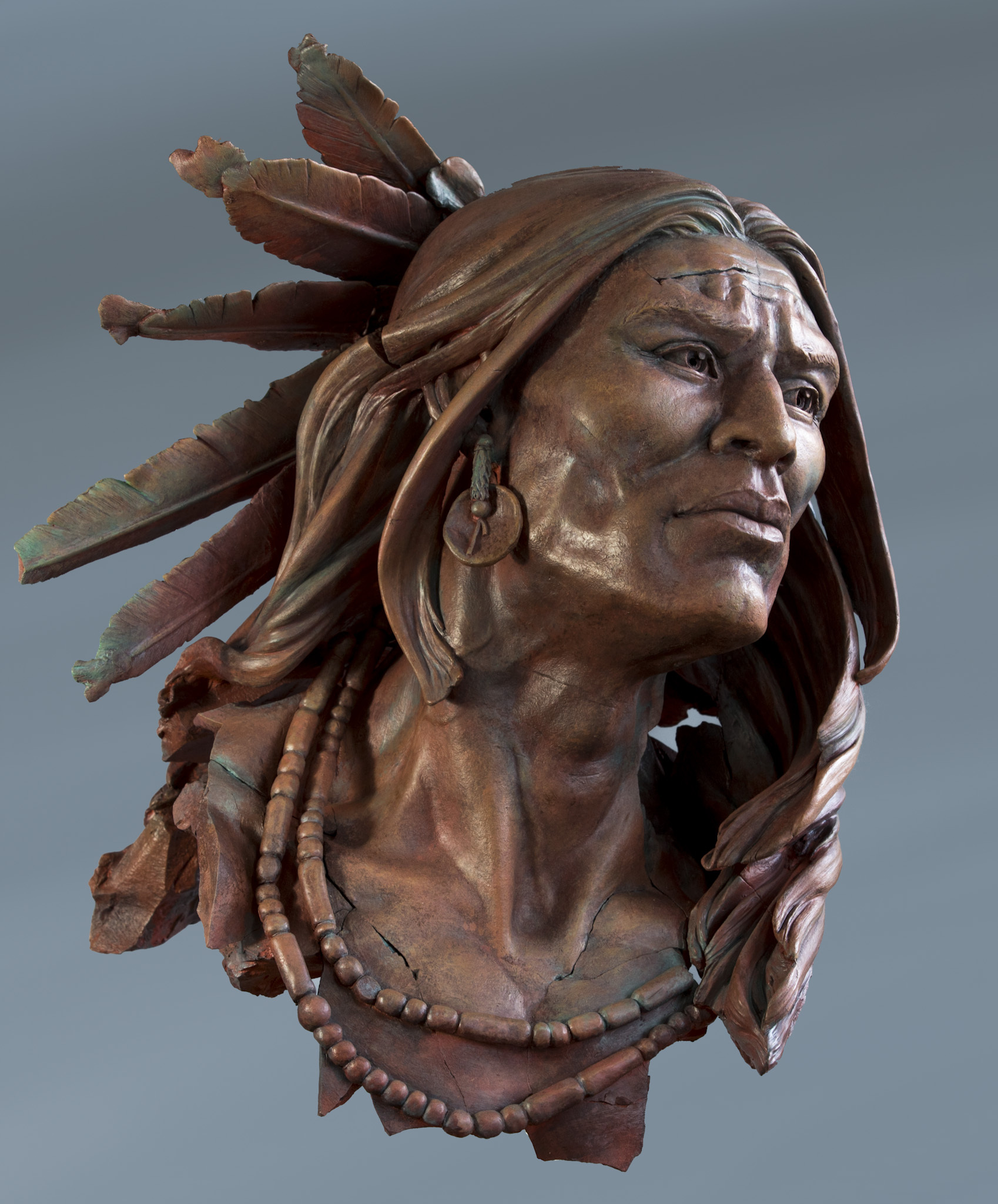 Beeld van een prairie indiaan, gemaakt in klei, gebakken en beschilderd.