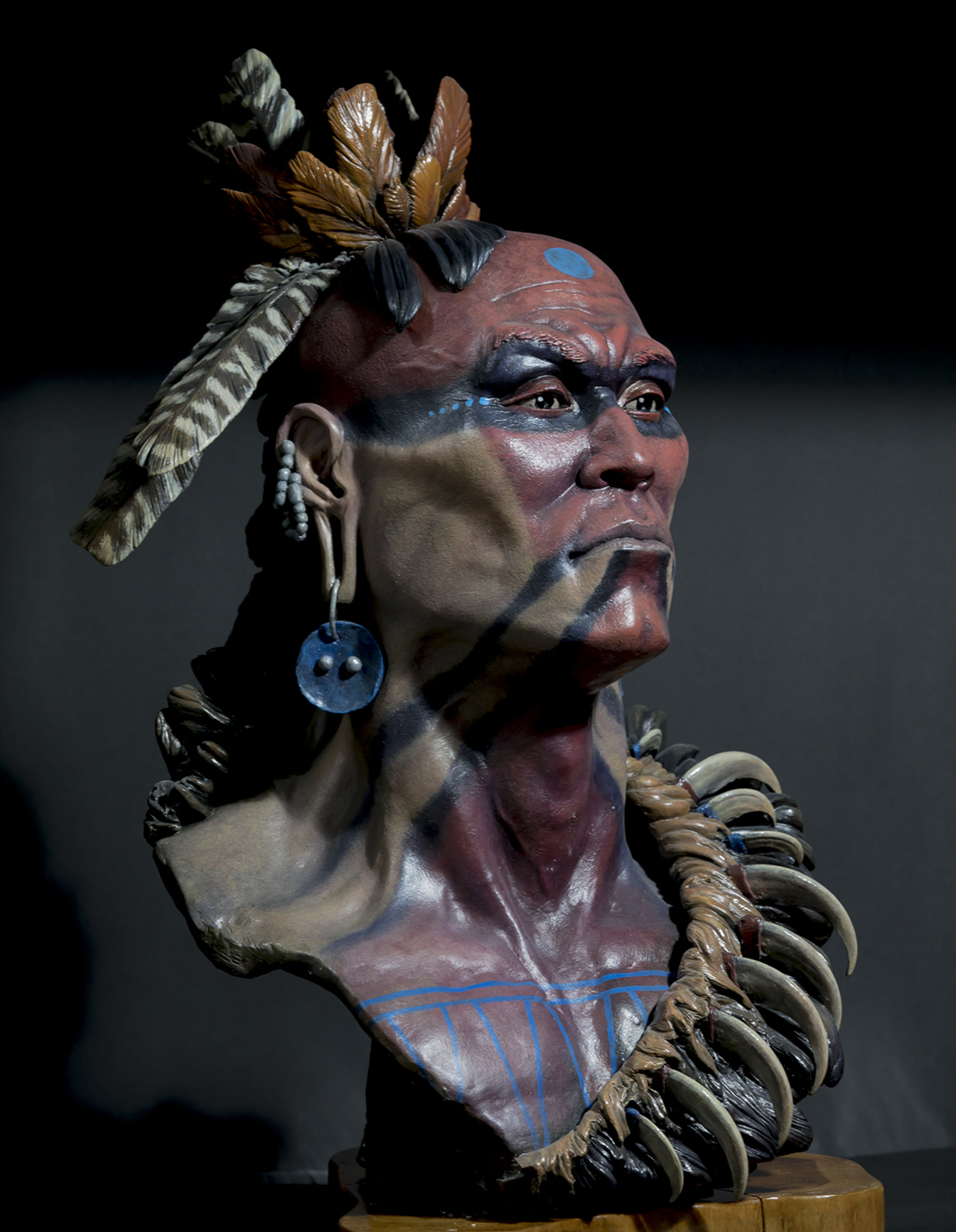 De Susquehannock, die vandaag de dag bijna volledig vergeten zijn, waren ten tijde van het Europese contact één van de meest geduchte stammen van het Midden-Atlantische gebied en beheersten het grote gebied tussen de Potomac Rivier in Noord-Virginia tot Zuid-New York. Het eerste Europese contact met de Susquehannock vond plaats in 1608 toen Captain John Smith (uit Jamestown) de noordkant van de Chesapeake Bay verkende. Deze ontmoeting was vriendelijk, maar Smith was op zijn hoede vanwege hun reputatie en ontzet door hun grootte. Zijn latere verslagen beschreven hen als reuzen." www.dickshovel.com/susque.html Beeld gemaakt in klei, gebakken,beschilderd