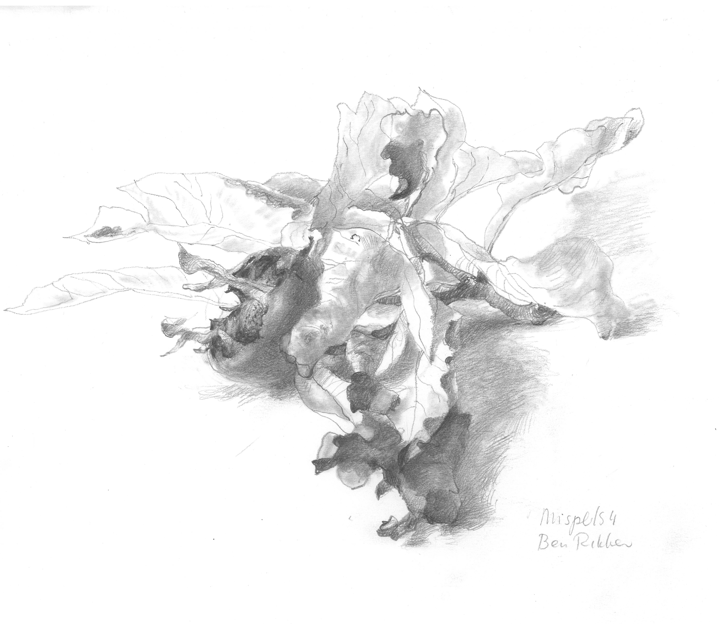 Studies van mispels, met en zonder blad. Potlood op crème kleurig papier Zie ook : https://www.benrikken.nl/tekeningen--divers--drawings-diverse