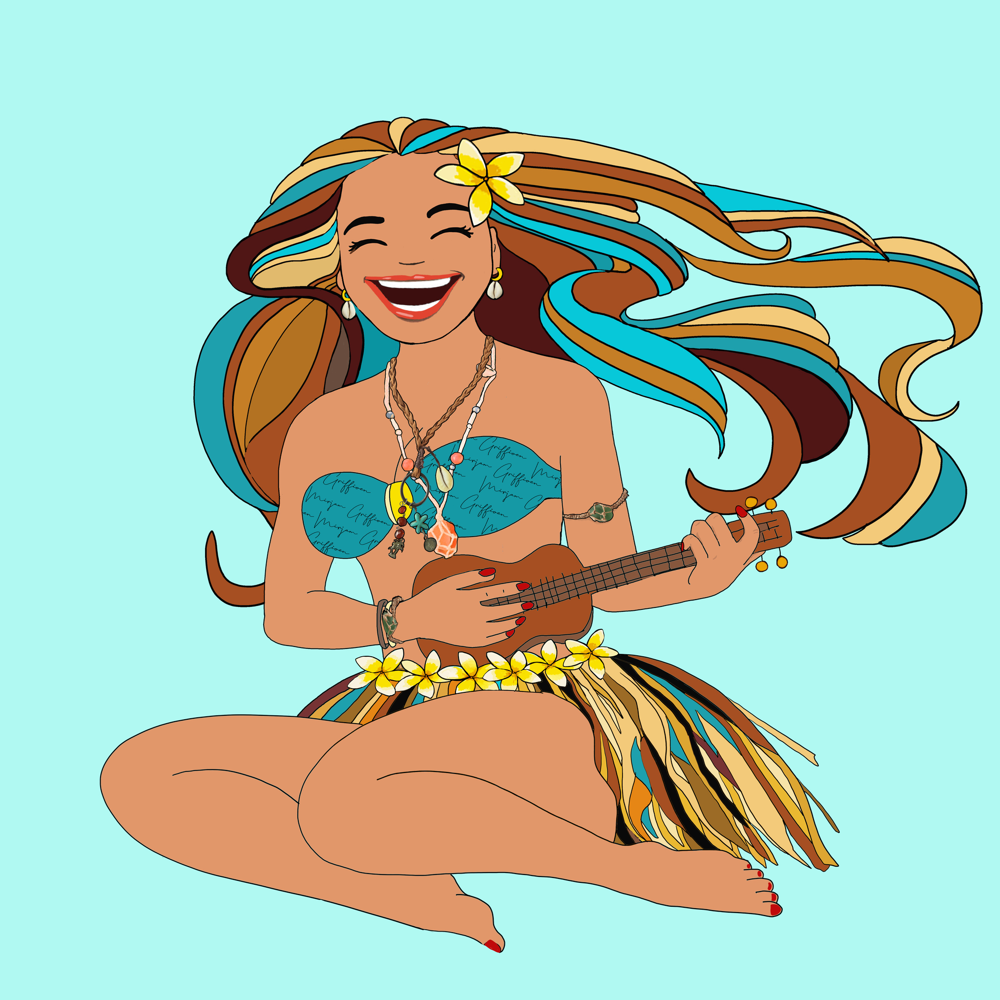 Happy Hawaiian Hula Girl with her guitar, Hula meisje met gitaar.