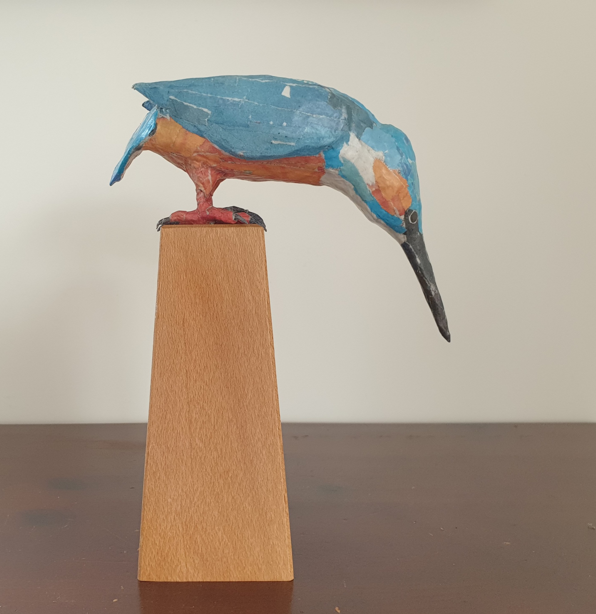 Ijsvogel van krantenpapier op oude stoelpoot. Geen verf gebruikt.