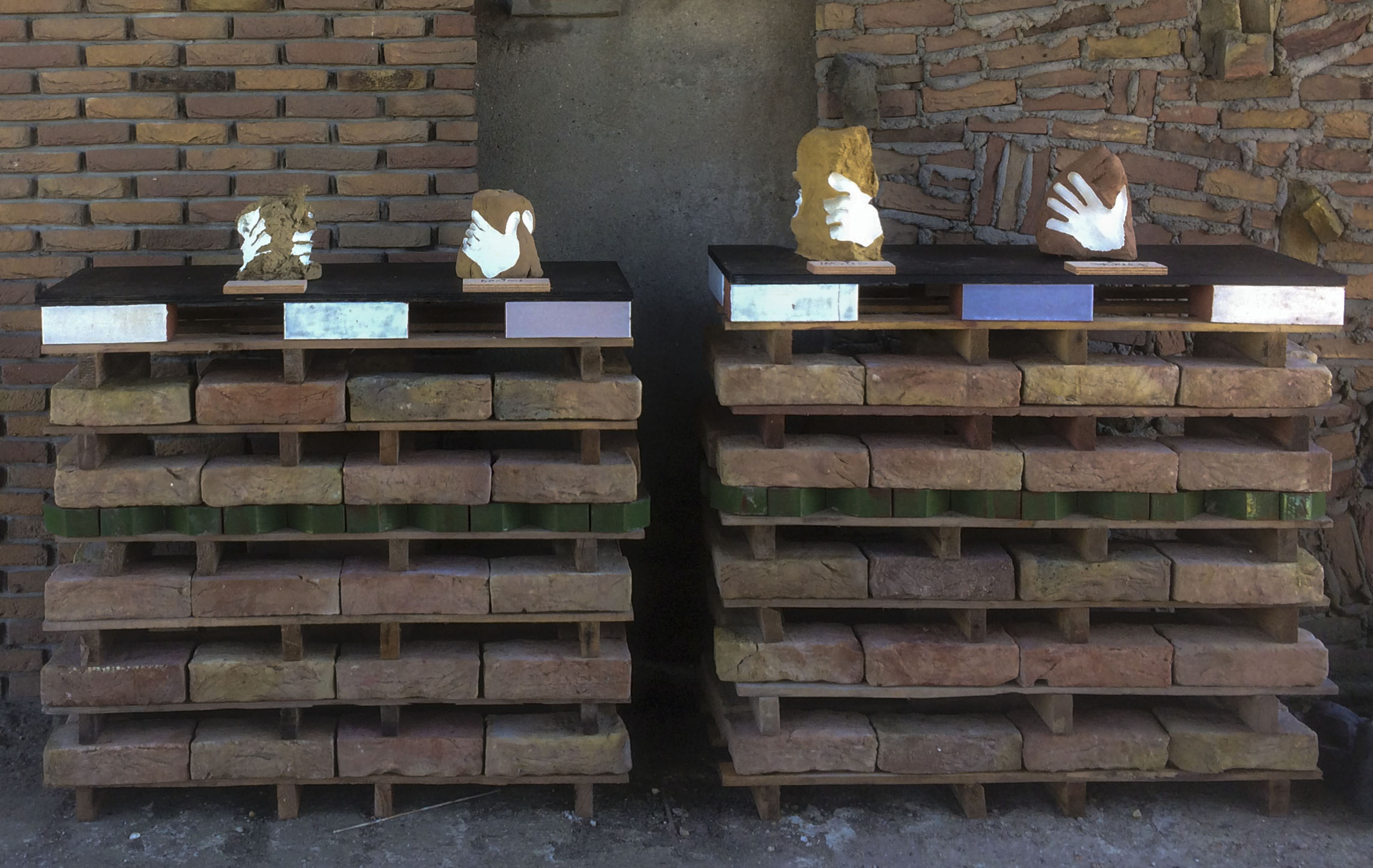 de handafdrukken van vier medewerkers; zij pakken een klomp klei en gooien die in een vormbak om een baksteen te vormen. zij staan op een sokkel van kloostermoppen, geglazuurde stenen, afvalpallets en afvalhout.