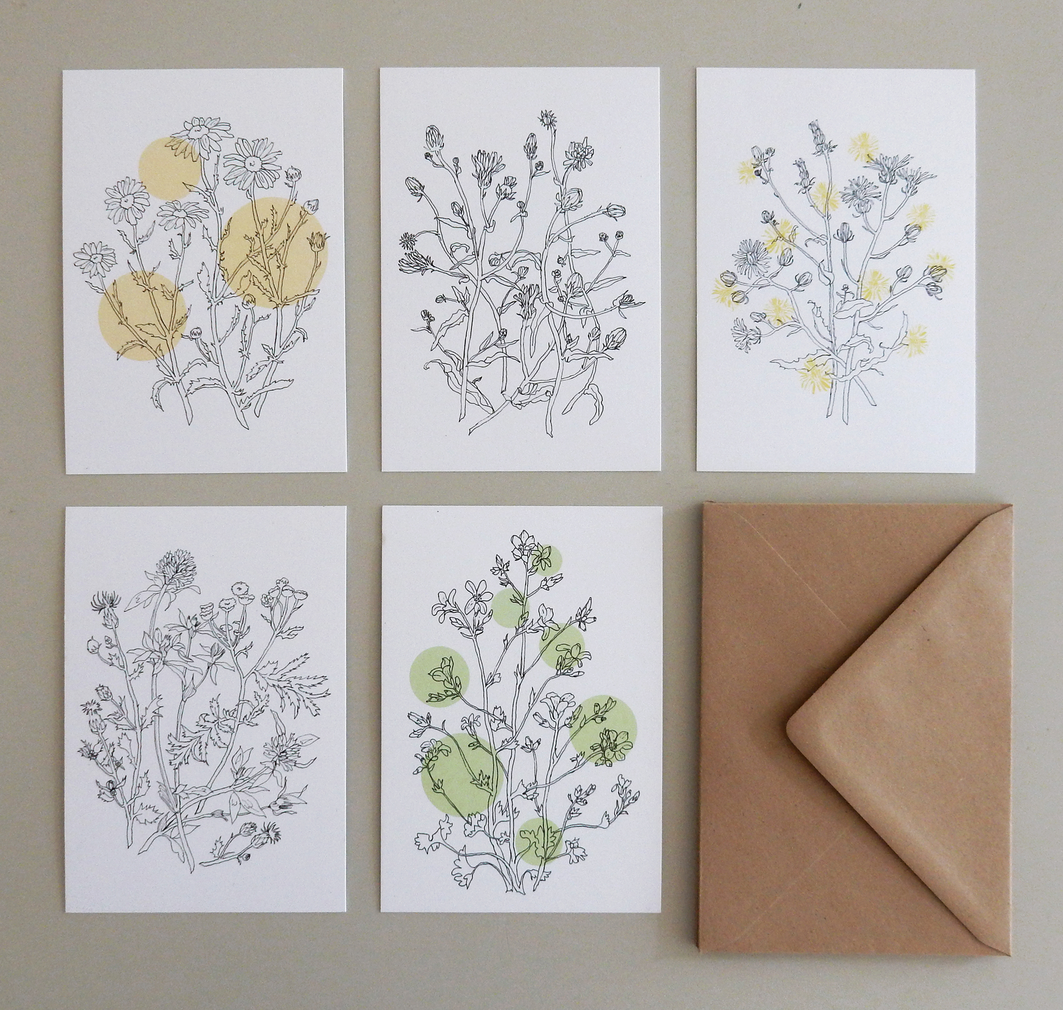 5 kaarten met veldbloemen. * Formaat 10.5x14.8 cm * Inclusief 5 kraft enveloppen * Ecovriendelijk gedrukt op 350 grams, 100% gerecycled wit FSC papier. Kijk voor meer informatie en grotere afbeeldingen bij mijn Bloemen - tekeningen.
