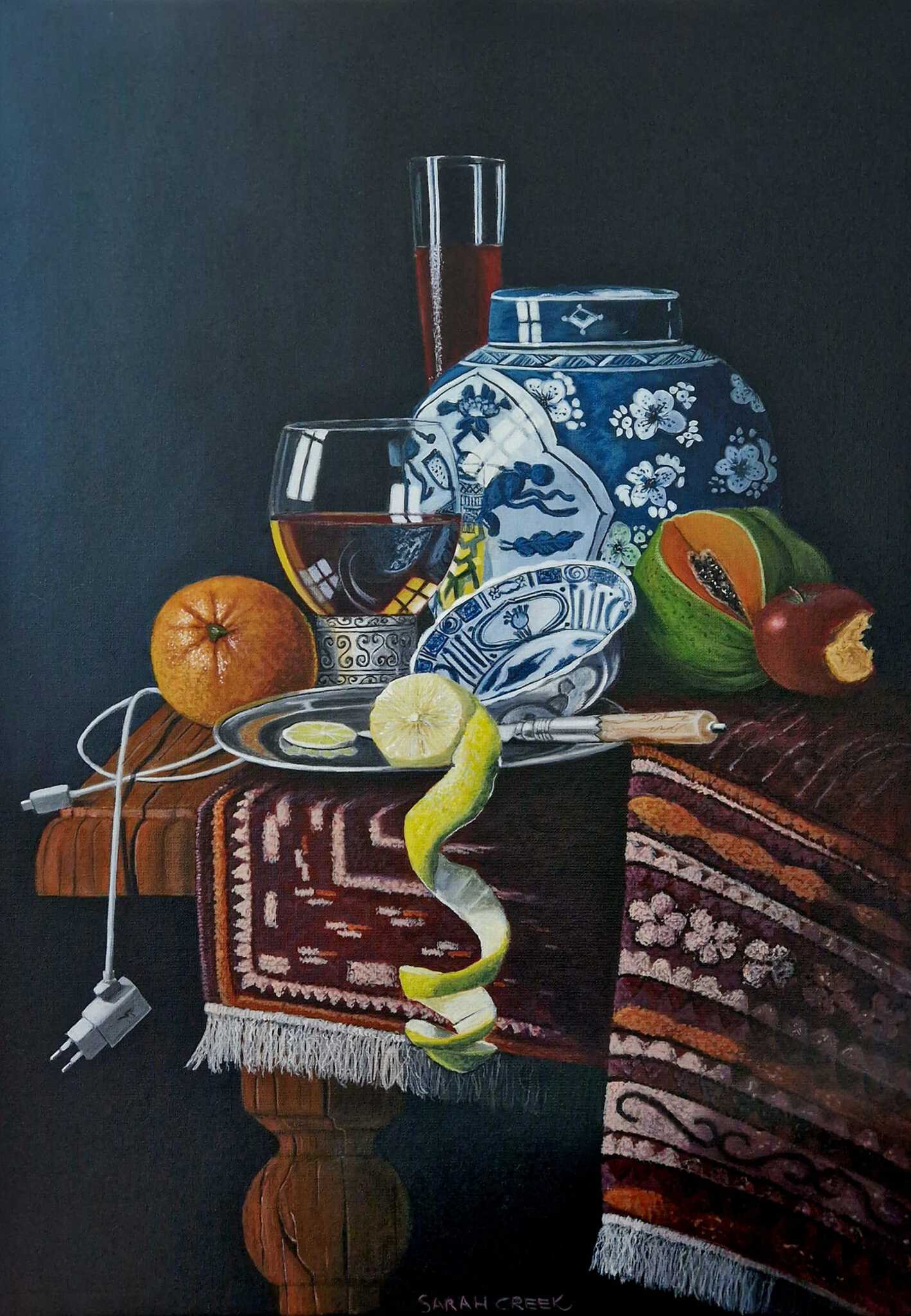 Sarah Creek schildert met acryl op canvas of linnen. Onderwerpen zijn portretten en stillevens. Sarah geeft les aan 55 talentvolle cursisten in een atelier aan huis.