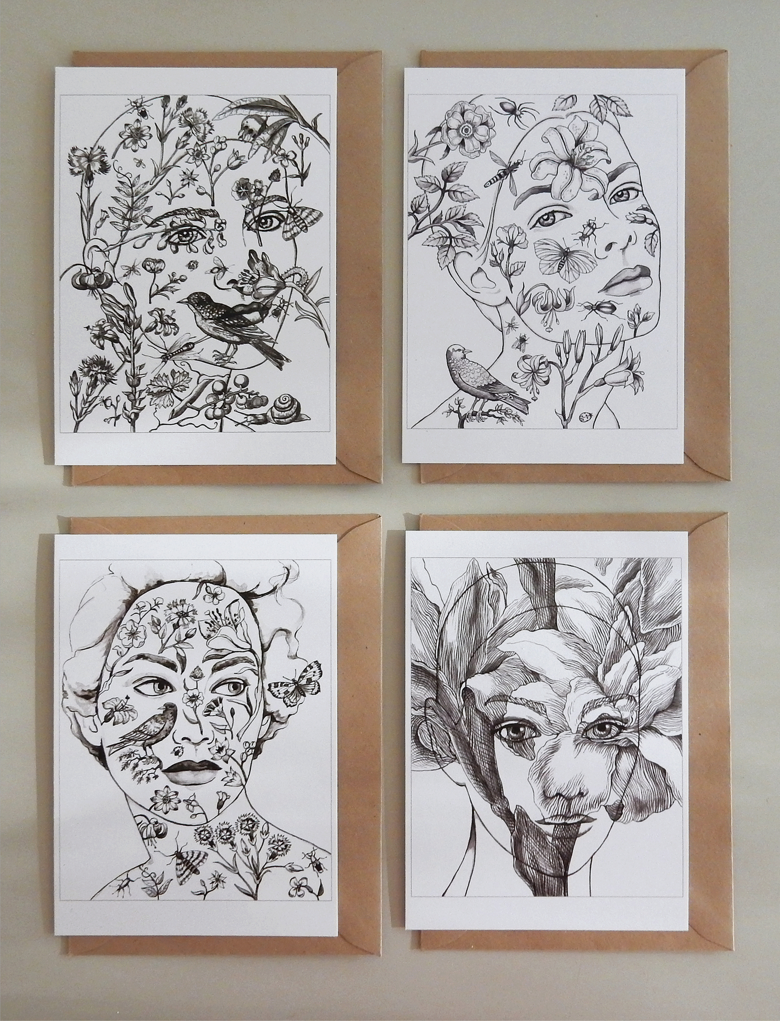 4 kaarten met -innerlijke- vrouwenportretten * Formaat 10.5x14.8 cm * Inclusief 4 kraft enveloppen * Ecovriendelijk gedrukt op 350 grams, 100% gerecycled wit FSC papier. Kijk voor meer informatie en grotere afbeeldingen bij mijn Vrouwen - tekeningen.