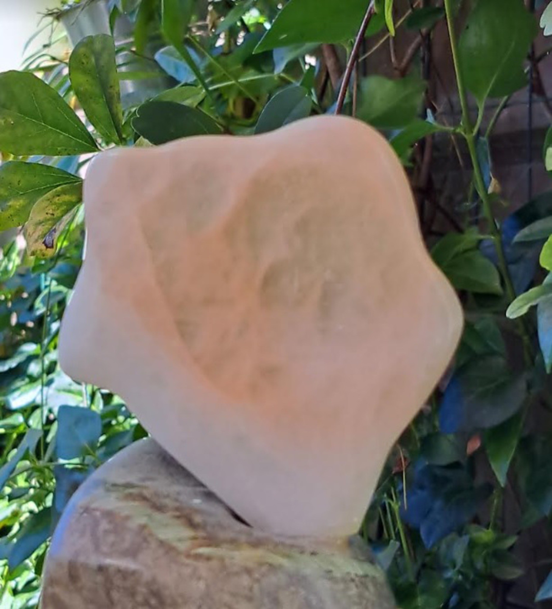(klik op de afbeelding voor de prijs en om het werk groter te bekijken) 'IJsbloem' is een combinatiebeeld: oranje seleniet geplaatst in een ondergrond van zwart opaal serpentijn. Seleniet is, zoals op de foto te zien is, prachtig licht doorlatend.