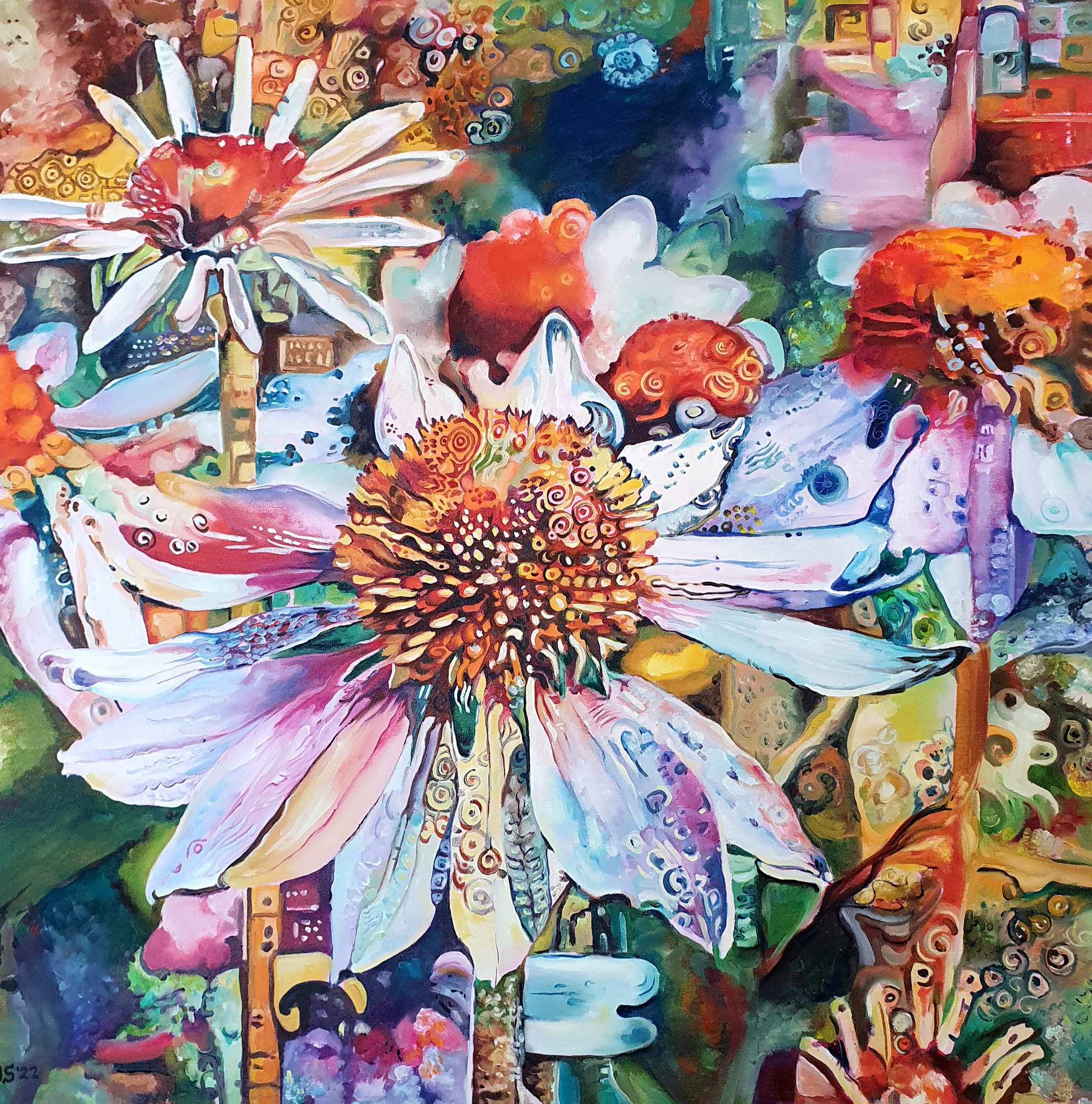 Foto van de zonnehoed digitaal bewerkt en dat in olieverf geschilderd.